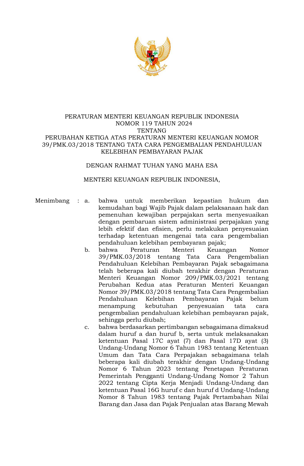 PERMEN Nomor 119 Tahun 2024 | Peraturan Menteri Nomor 119 Tahun 2024 tentang RPMK tentang Perubahan Ketiga atas Peraturan Menteri Keuangan Nomor 39/PMK.03/2018 tentang Tata Cara Pengembalian Pendahuluan Kelebihan Pembayaran Pajak