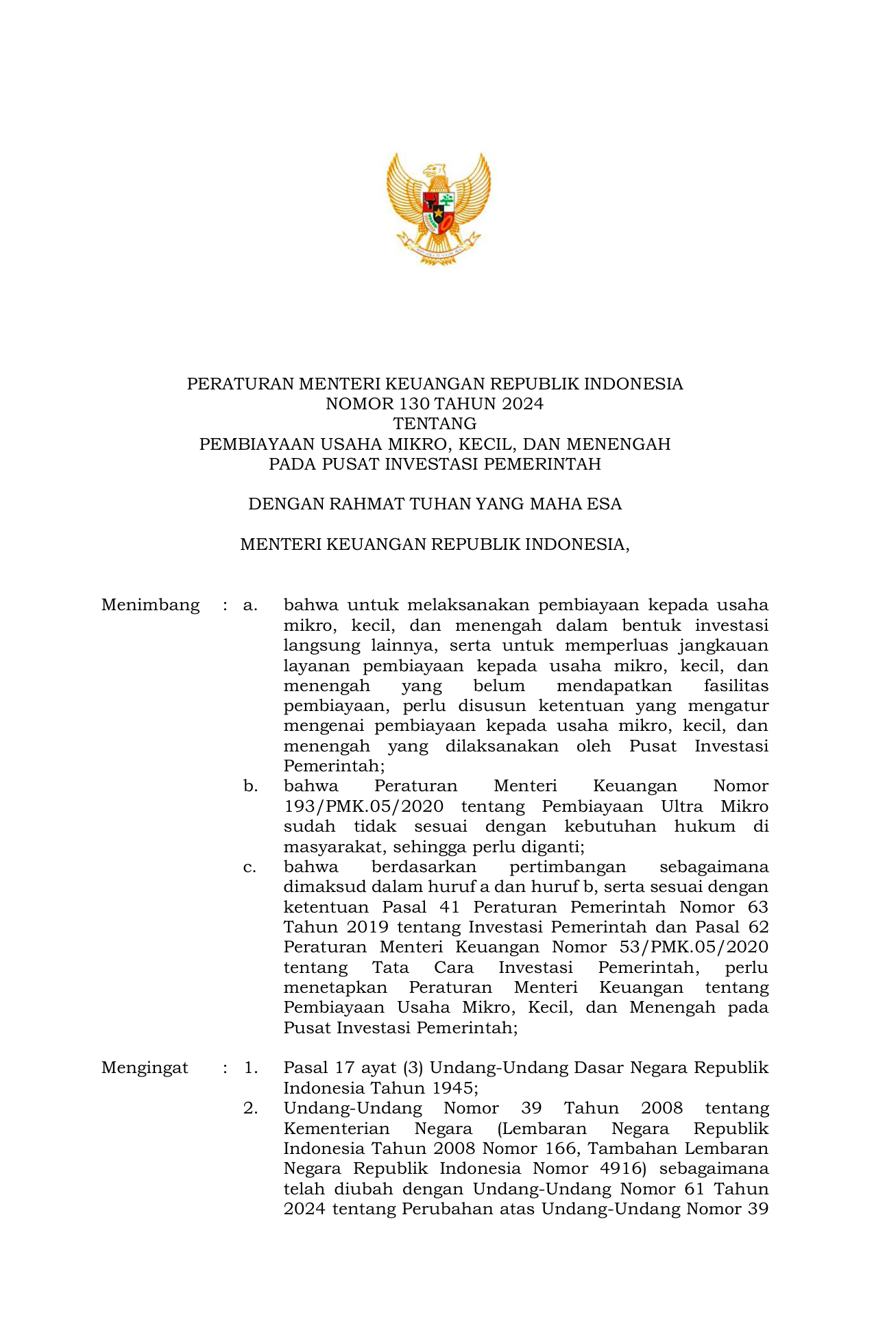 PERMEN Nomor 130 Tahun 2024 | Peraturan Menteri Nomor 130 Tahun 2024 tentang Pembiayaan Usaha Mikro, Kecil, dan Menengah pada Pusat Investasi Pemerintah (Perubahan PMK 193/2020 tentang Pembiayaan UMi)