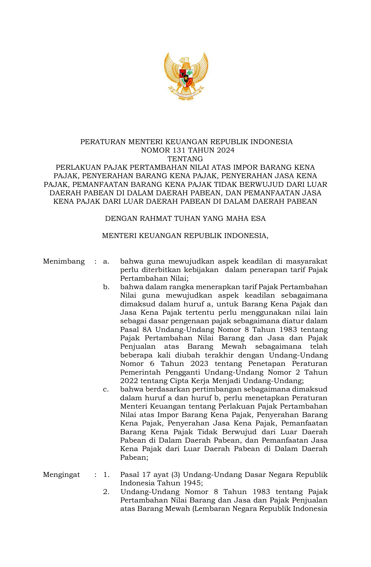 PERMEN Nomor 131 Tahun 2024 | Peraturan Menteri Nomor 131 Tahun 2024 tentang Perlakuan Pajak Pertambahan Nilai atas Impor Barang Kena Pajak, Penyerahan Barang Kena Pajak, Penyerahan Jasa Kena Pajak, Pemanfaatan Barang Kena Pajak Tidak Berwujud dari Luar Daerah Pabean di Dalam Daerah Pabean, dan Pemanfaatan Jasa Kena Pajak dari Lua