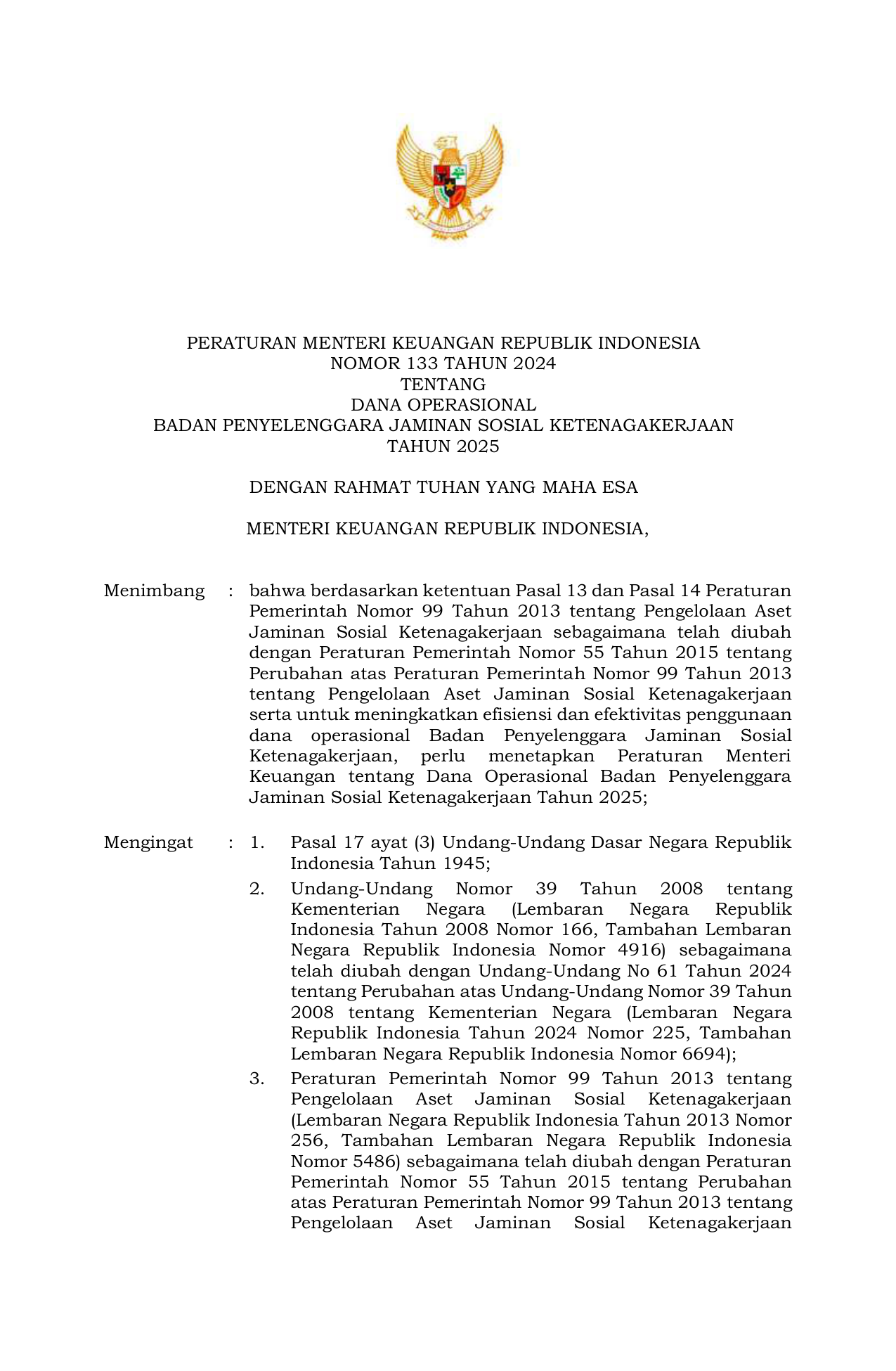 PERMEN Nomor 133 Tahun 2024 | Peraturan Menteri Nomor 133 Tahun 2024 tentang Dana Operasional Badan Penyelenggara Jaminan Sosial Ketenagakerjaan Tahun 2025