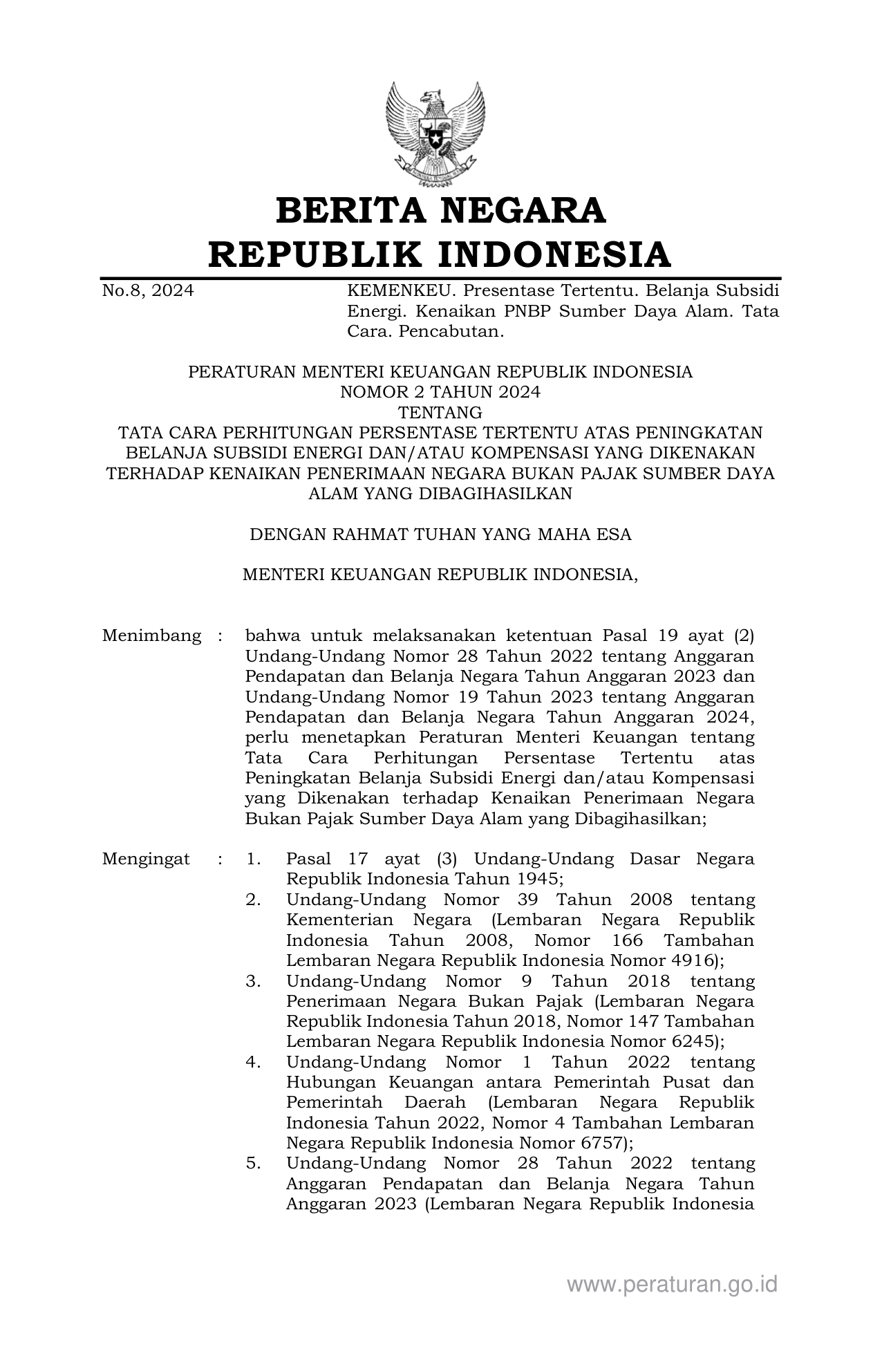 PERMEN Nomor 2 Tahun 2024 | Peraturan Menteri Nomor 2 Tahun 2024 tentang TATA CARA PERHITUNGAN PERSENTASE TERTENTU ATAS PENINGKATAN BELANJA SUBSIDI ENERGI DAN/ATAU KOMPENSASI YANG DIKENAKAN TERHADAP KENAIKAN PENERIMAAN NEGARA BUKAN PAJAK SUMBER DAYA ALAM YANG DIBAGIHASILKAN