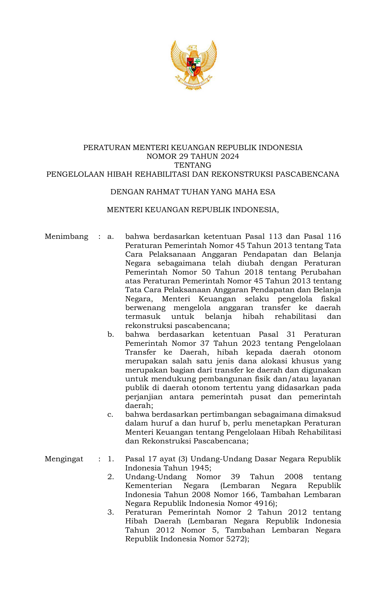 PERMEN Nomor 29 Tahun 2024 | Peraturan Menteri Nomor 29 Tahun 2024 tentang RPMK tentang Pengelolaan Hibah Rehabilitasi dan Rekonstruksi Pascabencana