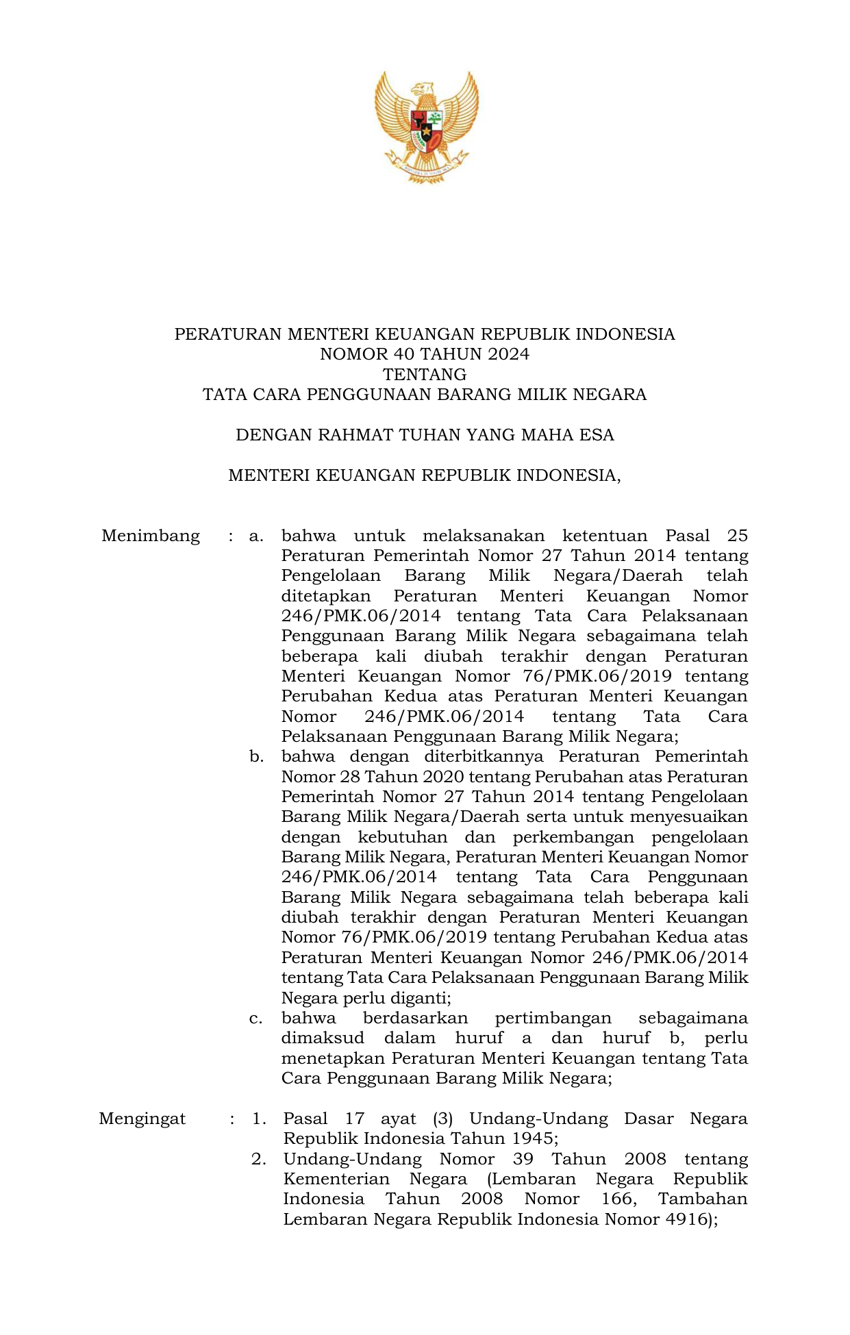 PERMEN Nomor 40 Tahun 2024 | Peraturan Menteri Nomor 40 Tahun 2024 tentang Tata Cara Penggunaan Barang Milik Negara