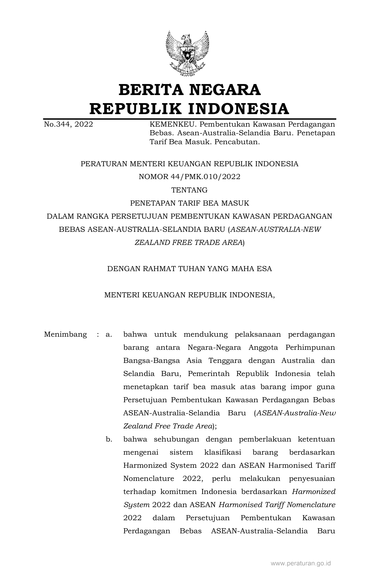PERMEN Nomor 44-pmk-010-2022 Tahun 2022 | Peraturan Menteri Nomor 44-pmk-010-2022 Tahun 2022 tentang PENETAPAN TARIF BEA MASUK DALAM RANGKA PERSETUJUAN PEMBENTUKAN KAWASAN PERDAGANGAN BEBAS ASEAN-AUSTRALIA-SELANDIA BARU (ASEAN-AUSTRALIA-NEW ZEALAND FREE TRADE AREA)