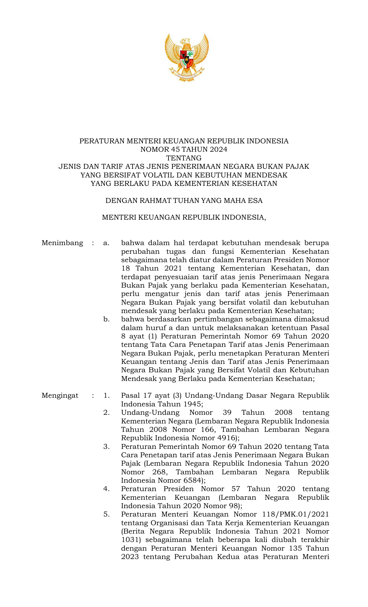 PERMEN Nomor 45 Tahun 2024 | Peraturan Menteri Nomor 45 Tahun 2024 tentang RPMK tentang Jenis dan Tarif atas Jenis Penerimaan Negara Bukan Pajak Kebutuhan Mendesak pada Kementerian Kesehatans