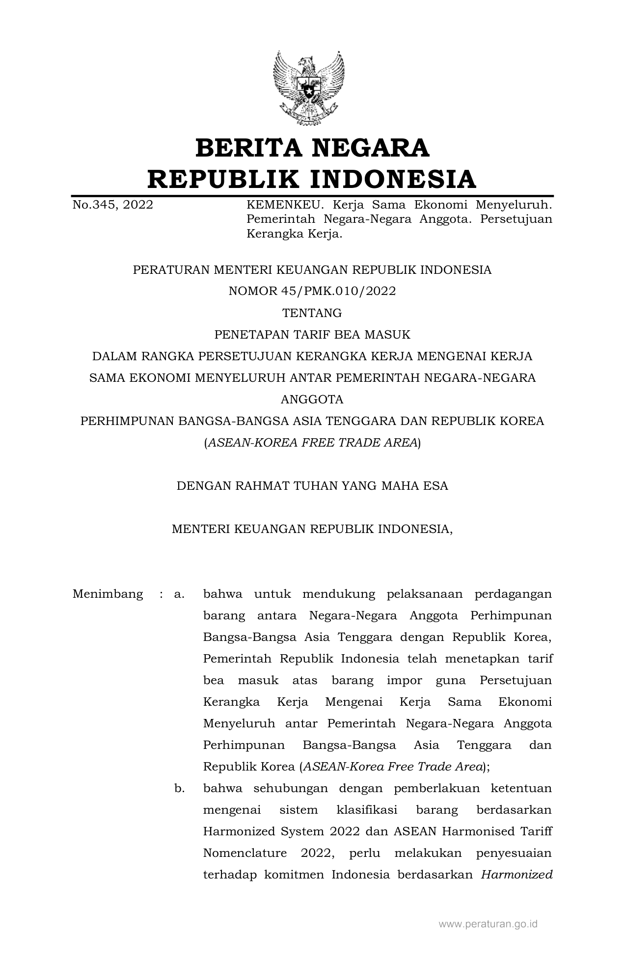 PERMEN Nomor 45-pmk-010-2022 Tahun 2022 | Peraturan Menteri Nomor 45-pmk-010-2022 Tahun 2022 tentang PENETAPAN TARIF BEA MASUK DALAM RANGKA PERSETUJUAN KERANGKA KERJA MENGENAI KERJA SAMA EKONOMI MENYELURUH ANTAR PEMERINTAH NEGARA-NEGARA ANGGOTA PERHIMPUNAN BANGSA-BANGSA ASIA TENGGARA DAN REPUBLIK KOREA (ASEAN-KOREA FREE TRADE AREA)