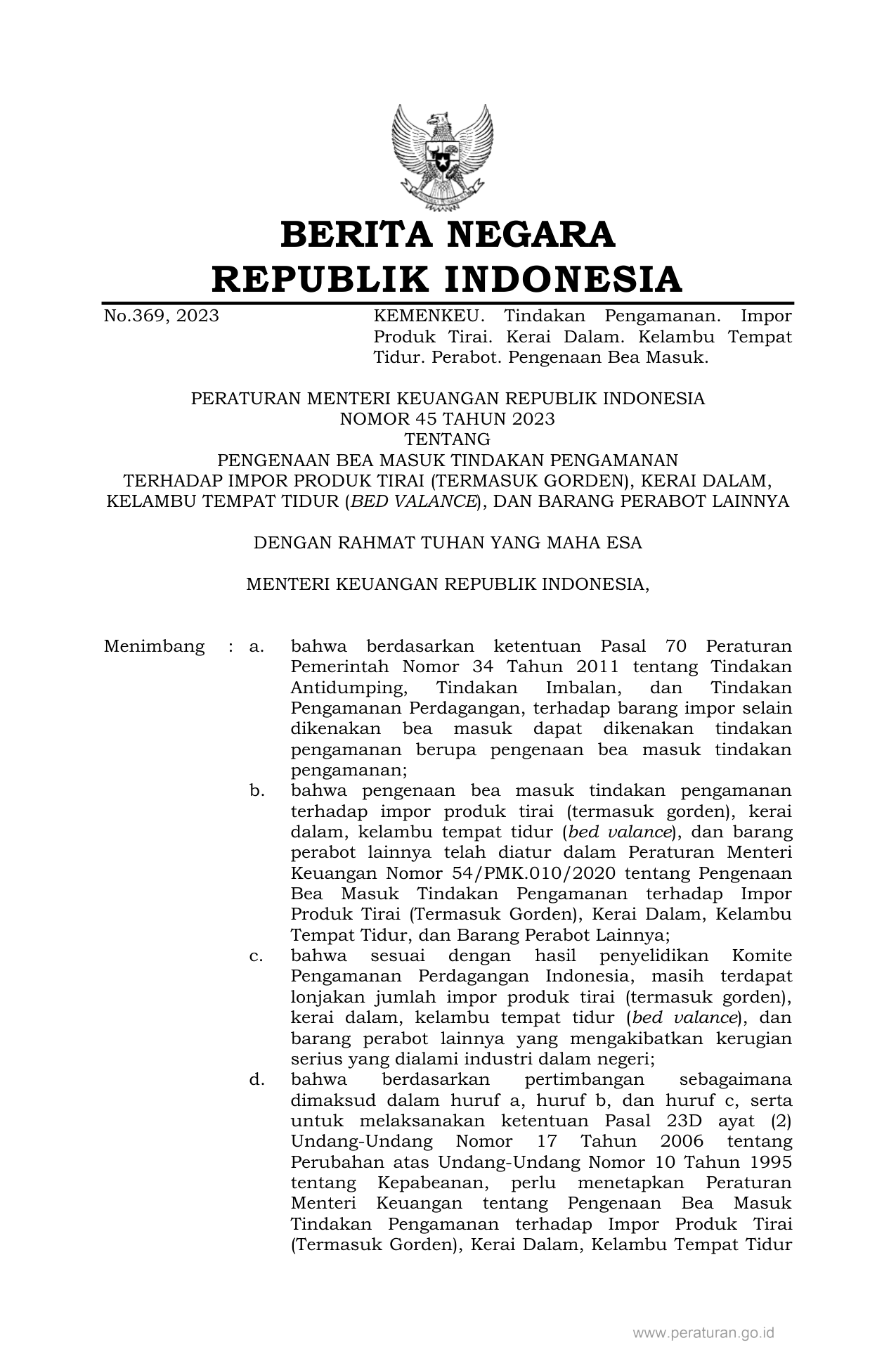 PERMEN Nomor 45 Tahun 2023 | Peraturan Menteri Nomor 45 Tahun 2023 tentang PENGENAAN BEA MASUK TINDAKAN PENGAMANAN TERHADAP IMPOR PRODUK TIRAI (TERMASUK GORDEN), KERAI DALAM, KELAMBU TEMPAT TIDUR (BED VALANCE), DAN BARANG PERABOT LAINNYA