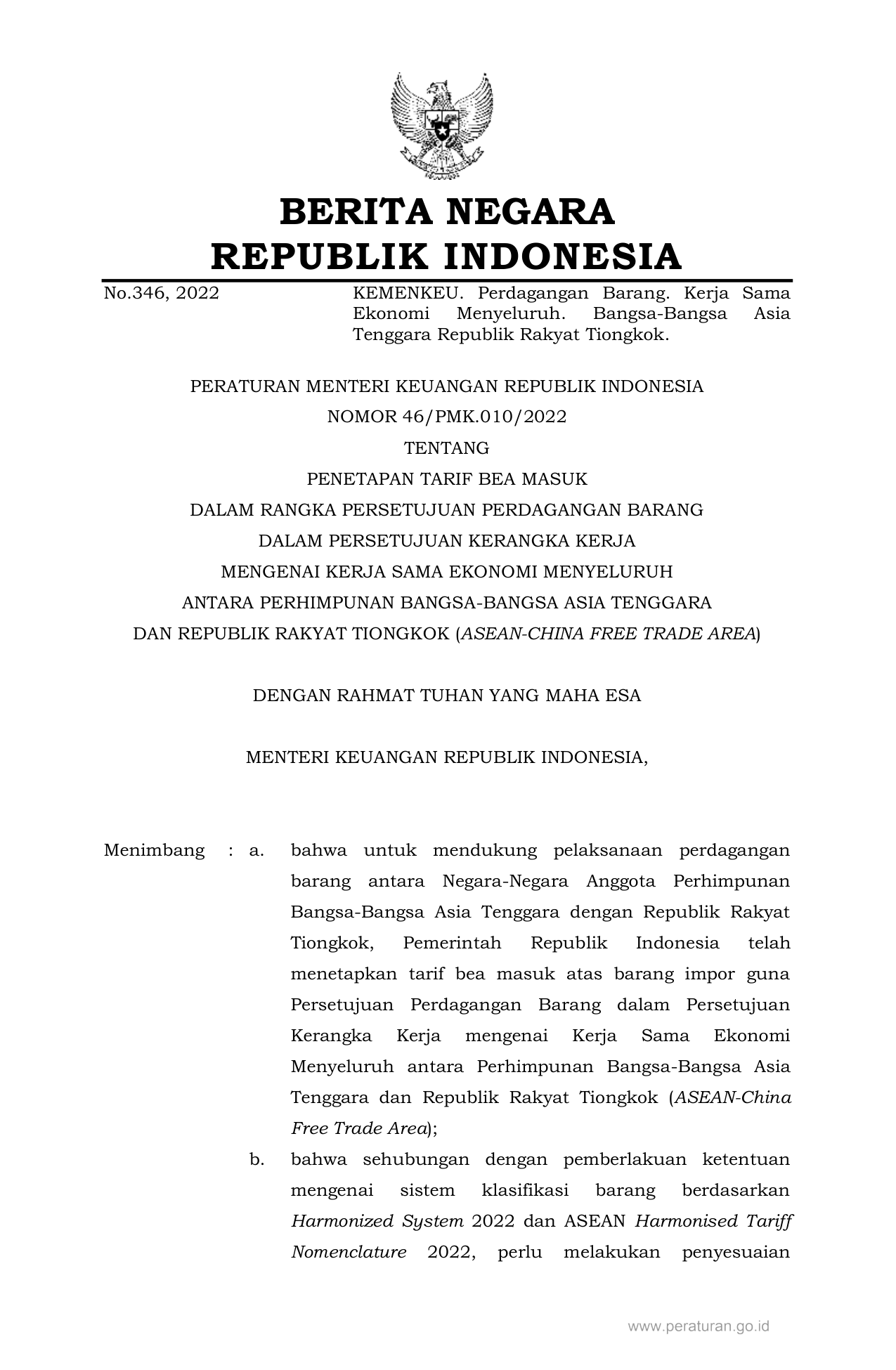 PERMEN Nomor 46-pmk-010-2022 Tahun 2022 | Peraturan Menteri Nomor 46-pmk-010-2022 Tahun 2022 tentang PENETAPAN TARIF BEA MASUK DALAM RANGKA PERSETUJUAN PERDAGANGAN BARANG DALAM PERSETUJUAN KERANGKA KERJA MENGENAI KERJA SAMA EKONOMI MENYELURUH ANTARA PERHIMPUNAN BANGSA-BANGSA ASIA TENGGARA DAN REPUBLIK RAKYAT TIONGKOK (ASEAN-CHINA FREE TRADE AREA)