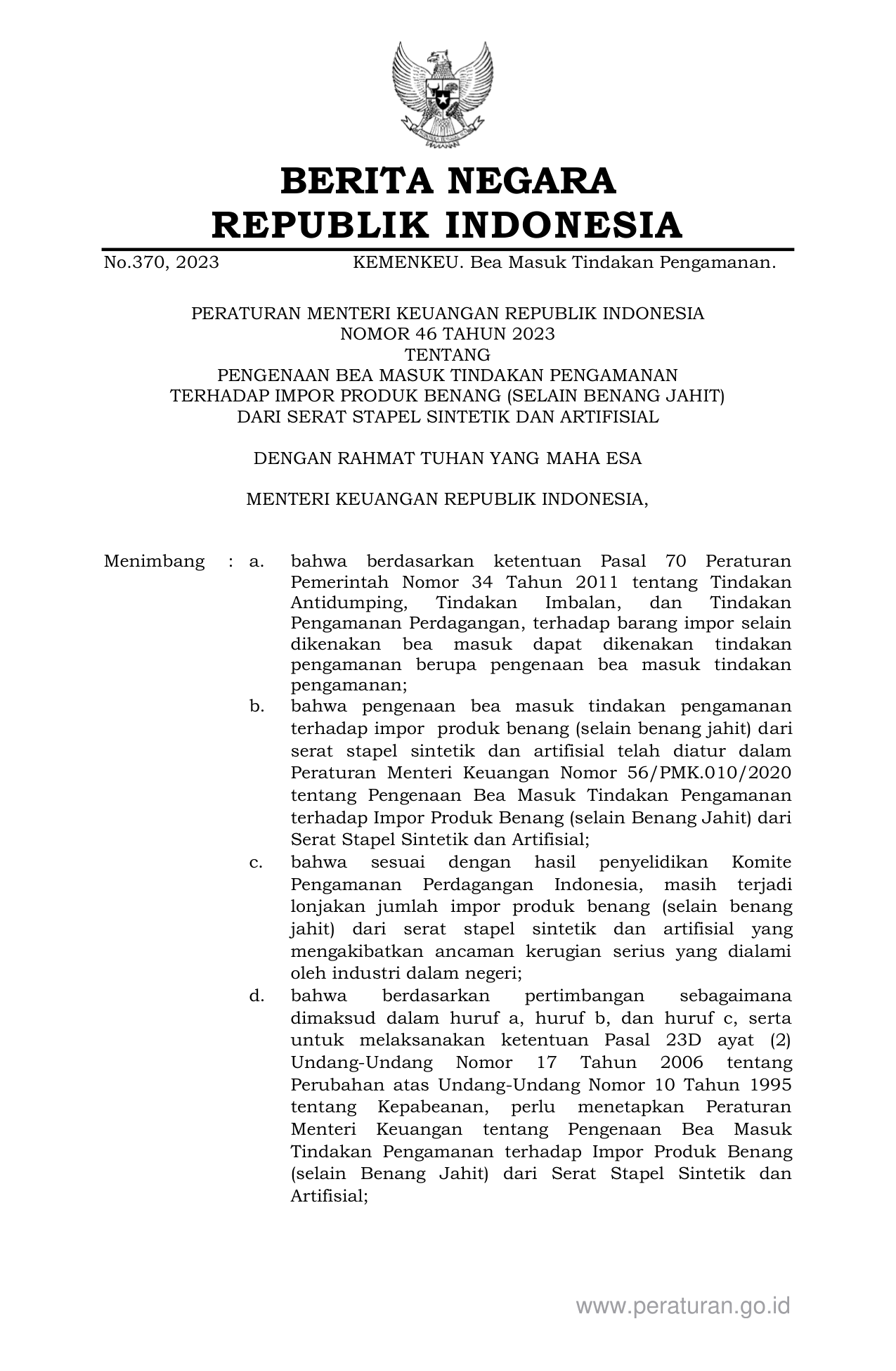 PERMEN Nomor 46 Tahun 2023 | Peraturan Menteri Nomor 46 Tahun 2023 tentang PENGENAAN BEA MASUK TINDAKAN PENGAMANAN TERHADAP IMPOR PRODUK BENANG (SELAIN BENANG JAHIT) DARI SERAT STAPEL SINTETIK DAN ARTIFISIAL