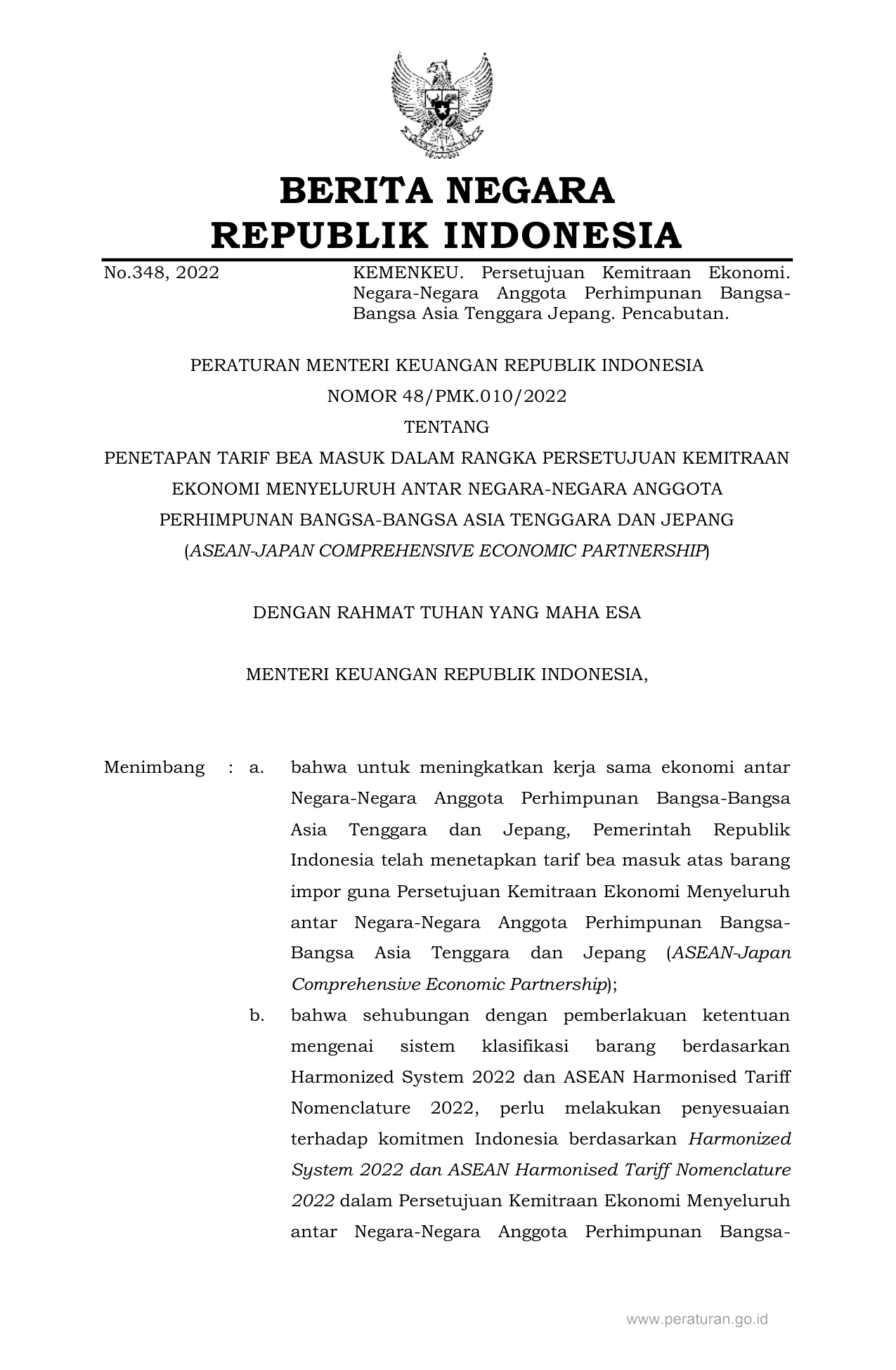 PERMEN Nomor 48-pmk-010-2022 Tahun 2022 | Peraturan Menteri Nomor 48-pmk-010-2022 Tahun 2022 tentang PENETAPAN TARIF BEA MASUK DALAM RANGKA PERSETUJUAN KEMITRAAN EKONOMI MENYELURUH ANTAR NEGARA-NEGARA ANGGOTA PERHIMPUNAN BANGSA-BANGSA ASIA TENGGARA DAN JEPANG (ASEAN-JAPAN COMPREHENSIVE ECONOMIC PARTNERSHIP)