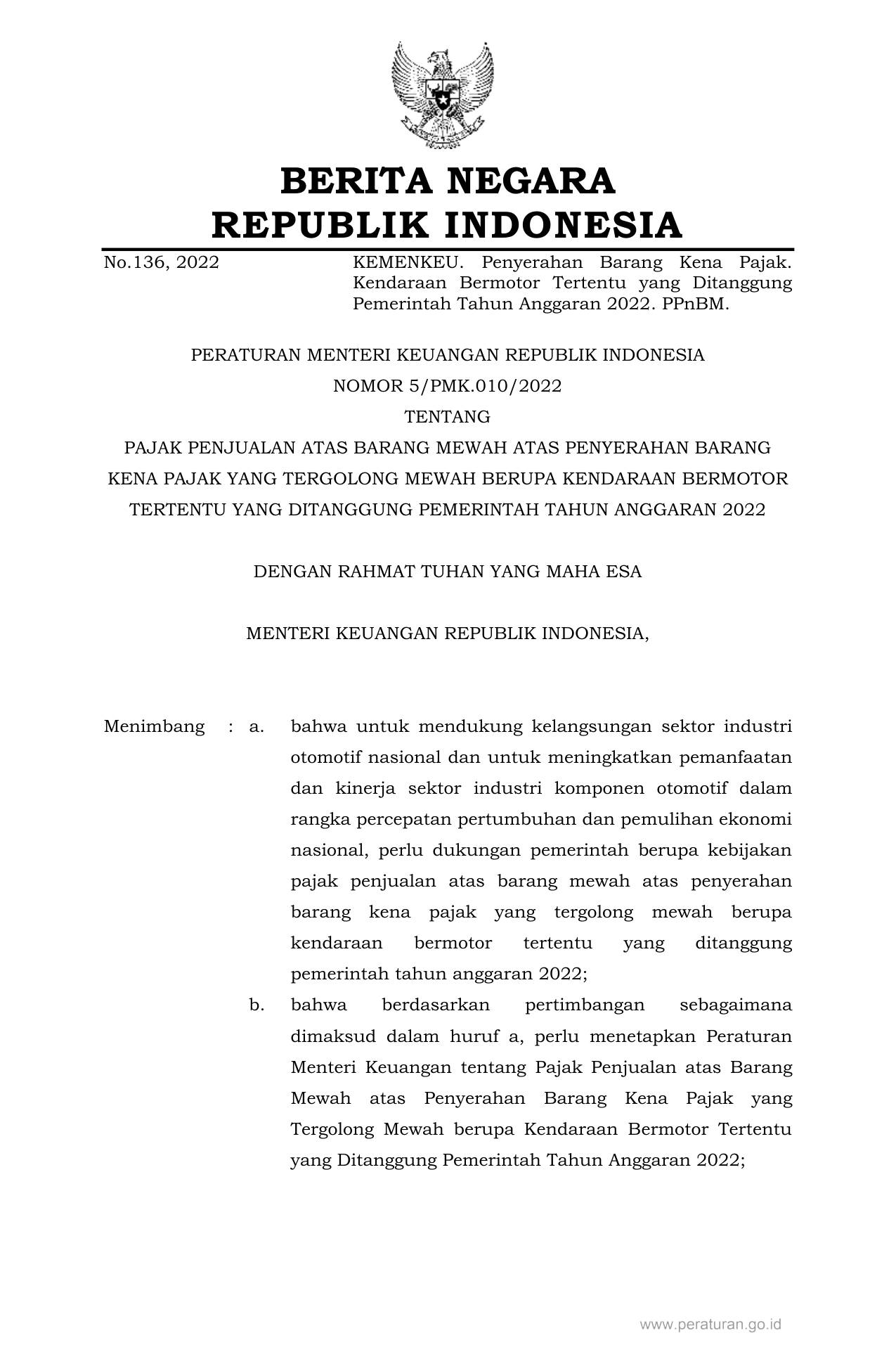 PERMEN Nomor 5-pmk-010-2022 Tahun 2022 | Peraturan Menteri Nomor 5-pmk-010-2022 Tahun 2022 tentang PAJAK PENJUALAN ATAS BARANG MEWAH ATAS PENYERAHAN BARANG KENA PAJAK YANG TERGOLONG MEWAH BERUPA KENDARAAN BERMOTOR TERTENTU YANG DITANGGUNG PEMERINTAH TAHUN ANGGARAN 2022