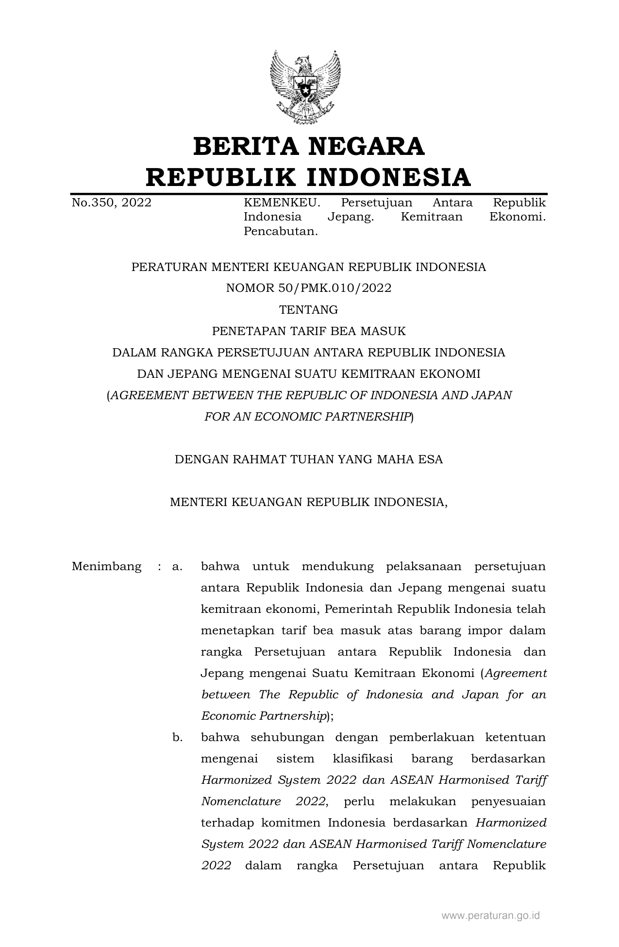 PERMEN Nomor 50-pmk-010-2022 Tahun 2022 | Peraturan Menteri Nomor 50-pmk-010-2022 Tahun 2022 tentang PENETAPAN TARIF BEA MASUK DALAM RANGKA PERSETUJUAN ANTARA REPUBLIK INDONESIA DAN JEPANG MENGENAI SUATU KEMITRAAN EKONOMI (AGREEMENT BETWEEN THE REPUBLIC OF INDONESIA AND JAPAN FOR AN ECONOMIC PARTNERSHIP)