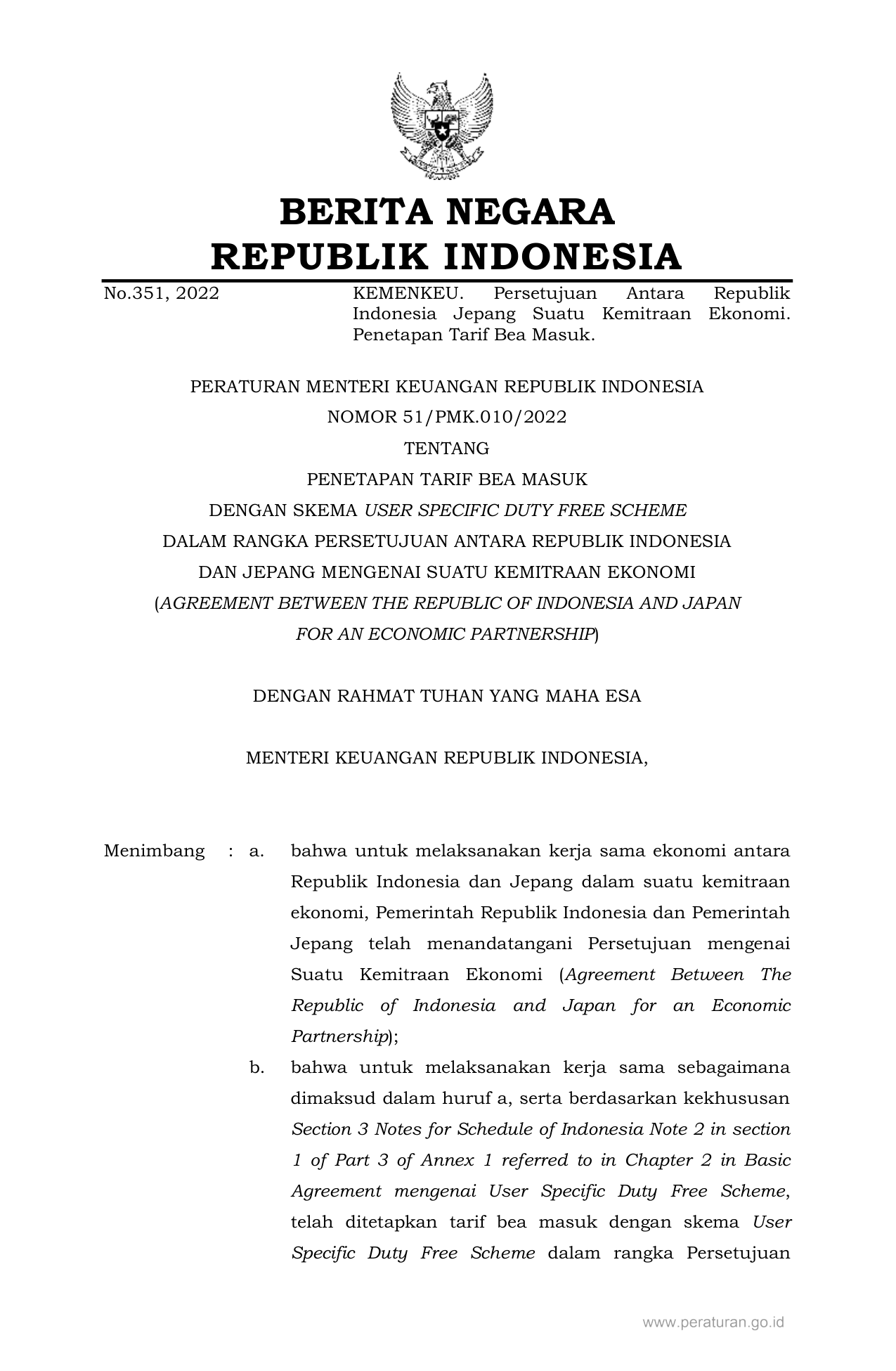 PERMEN Nomor 51-pmk-010-2022 Tahun 2022 | Peraturan Menteri Nomor 51-pmk-010-2022 Tahun 2022 tentang PENETAPAN TARIF BEA MASUK DENGAN SKEMA USER SPECIFIC DUTY FREE SCHEME DALAM RANGKA PERSETUJUAN ANTARA REPUBLIK INDONESIA DAN JEPANG MENGENAI SUATU KEMITRAAN EKONOMI (AGREEMENT BETWEEN THE REPUBLIC OF INDONESIA AND JAPAN FOR AN ECONOMIC PARTNERSHIP)