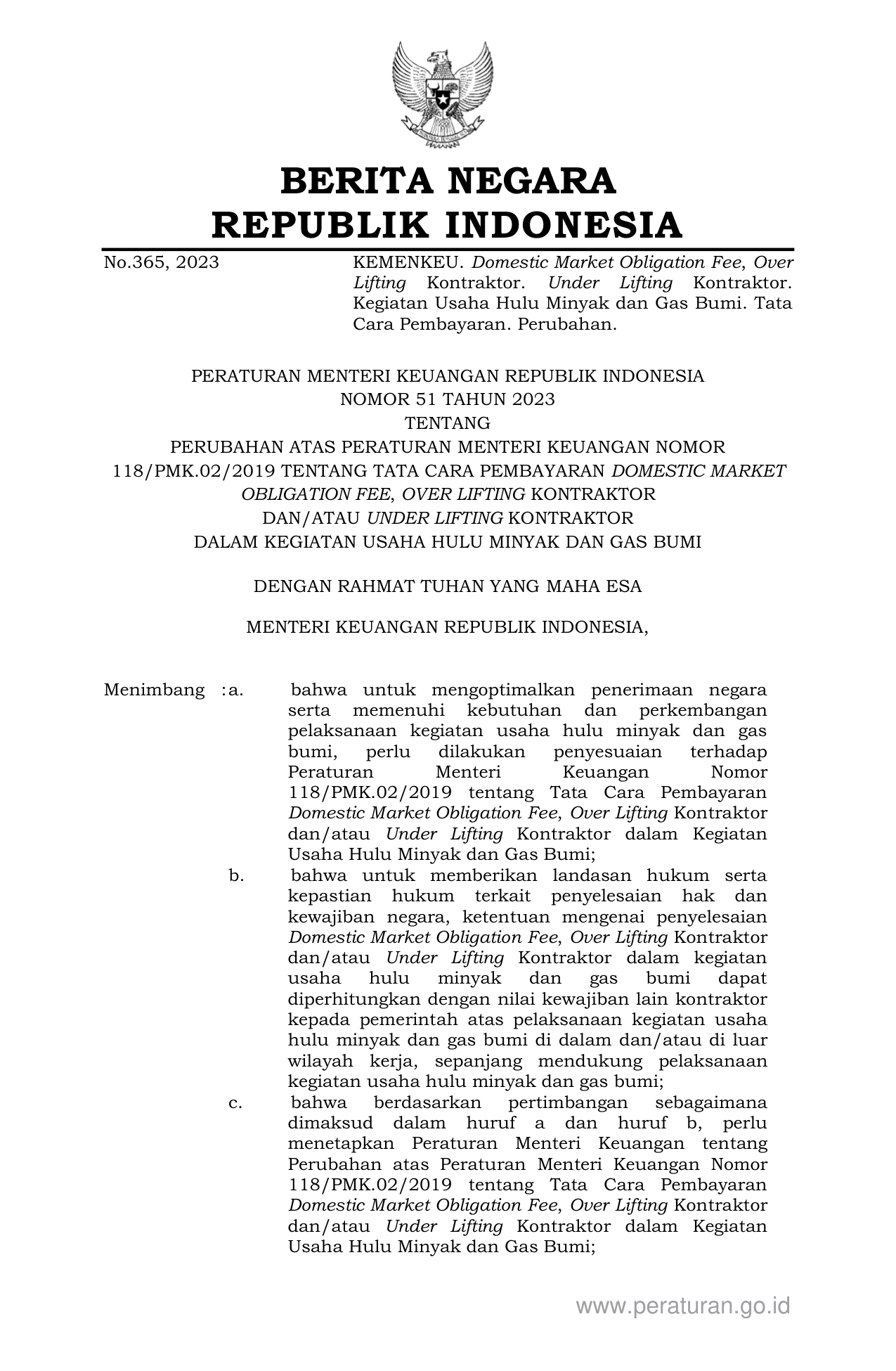 PERMEN Nomor 51 Tahun 2023 | Peraturan Menteri Nomor 51 Tahun 2023 tentang PERUBAHAN ATAS PERATURAN MENTERI KEUANGAN NOMOR 118/PMK.02/2019 TENTANG TATA CARA PEMBAYARAN DOMESTIC MARKET OBLIGATION FEE, OVER LIFTING KONTRAKTOR DAN/ATAU UNDER LIFTING KONTRAKTOR DALAM KEGIATAN USAHA HULU MINYAK DAN GAS BUMI