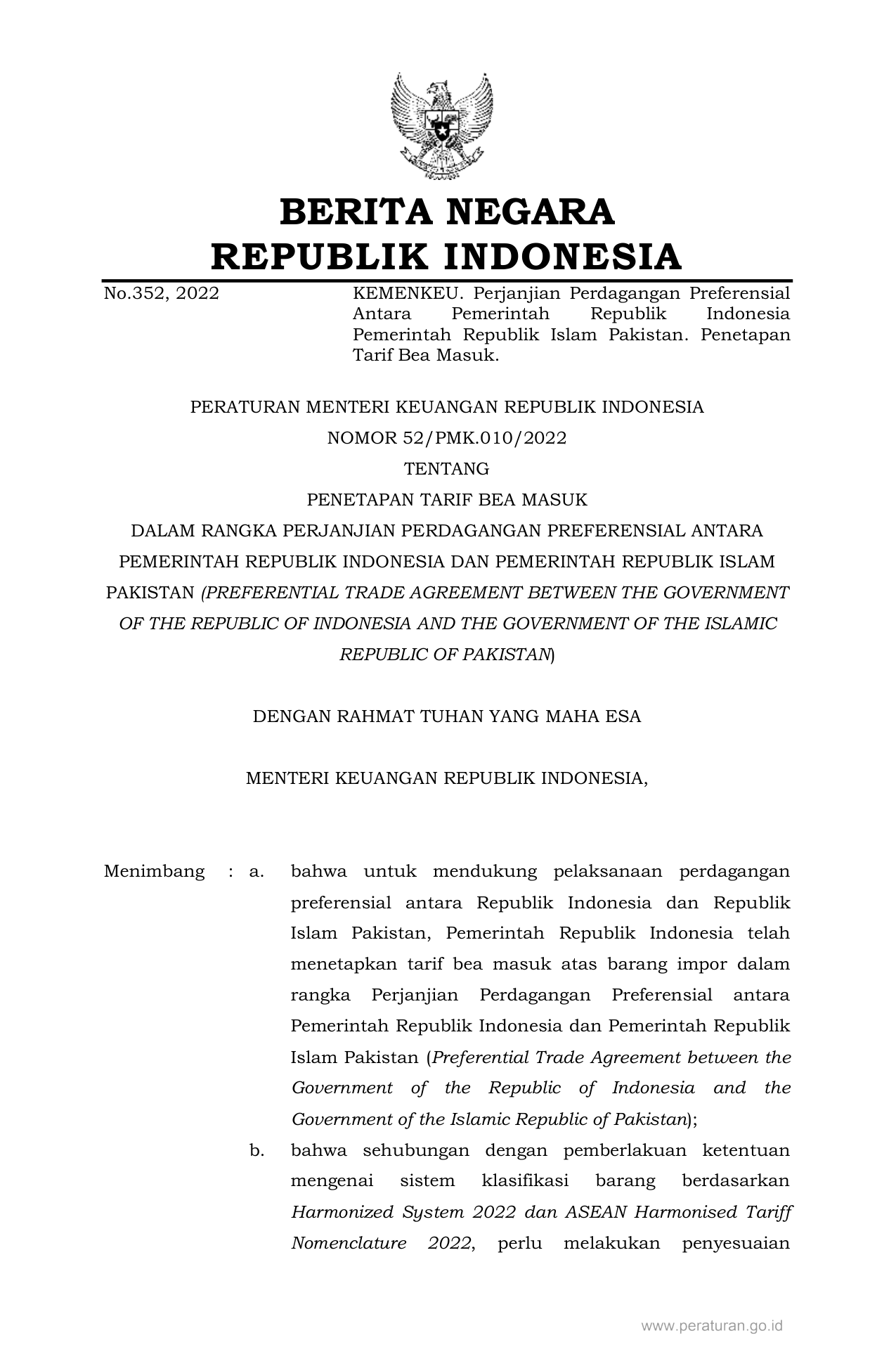 PERMEN Nomor 52-pmk-010-2022 Tahun 2022 | Peraturan Menteri Nomor 52-pmk-010-2022 Tahun 2022 tentang PENETAPAN TARIF BEA MASUK DALAM RANGKA PERJANJIAN PERDAGANGAN PREFERENSIAL ANTARA PEMERINTAH REPUBLIK INDONESIA DAN PEMERINTAH REPUBLIK ISLAM PAKISTAN (PREFERENTIAL TRADE AGREEMENT BETWEEN THE GOVERNMENT OF THE REPUBLIC OF INDONESIA AND THE GOVERNMENT OF THE ISLAMIC REPUBLIC OF PAKISTAN)
