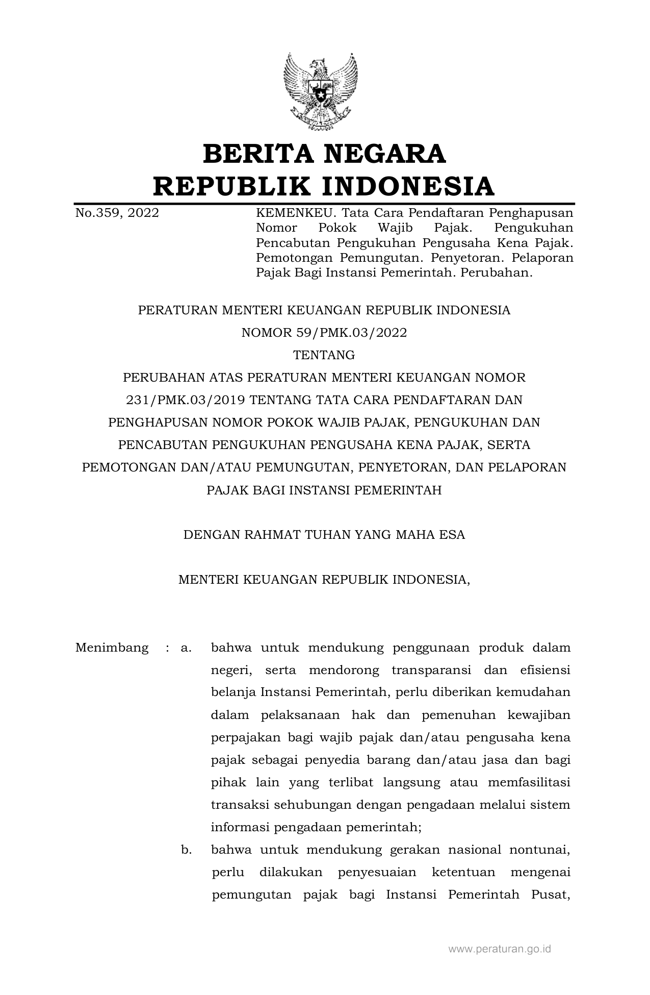 PERMEN Nomor 59-pmk-03-2022 Tahun 2022 | Peraturan Menteri Nomor 59-pmk-03-2022 Tahun 2022 tentang PERUBAHAN ATAS PERATURAN MENTERI KEUANGAN NOMOR 231/PMK.03/2019 TENTANG TATA CARA PENDAFTARAN DAN PENGHAPUSAN NOMOR POKOK WAJIB PAJAK, PENGUKUHAN DAN PENCABUTAN PENGUKUHAN PENGUSAHA KENA PAJAK, SERTA PEMOTONGAN DAN/ATAU PEMUNGUTAN, PENYETORAN, DAN PELAPORAN PAJAK BAGI INSTANSI PEMERINTAH