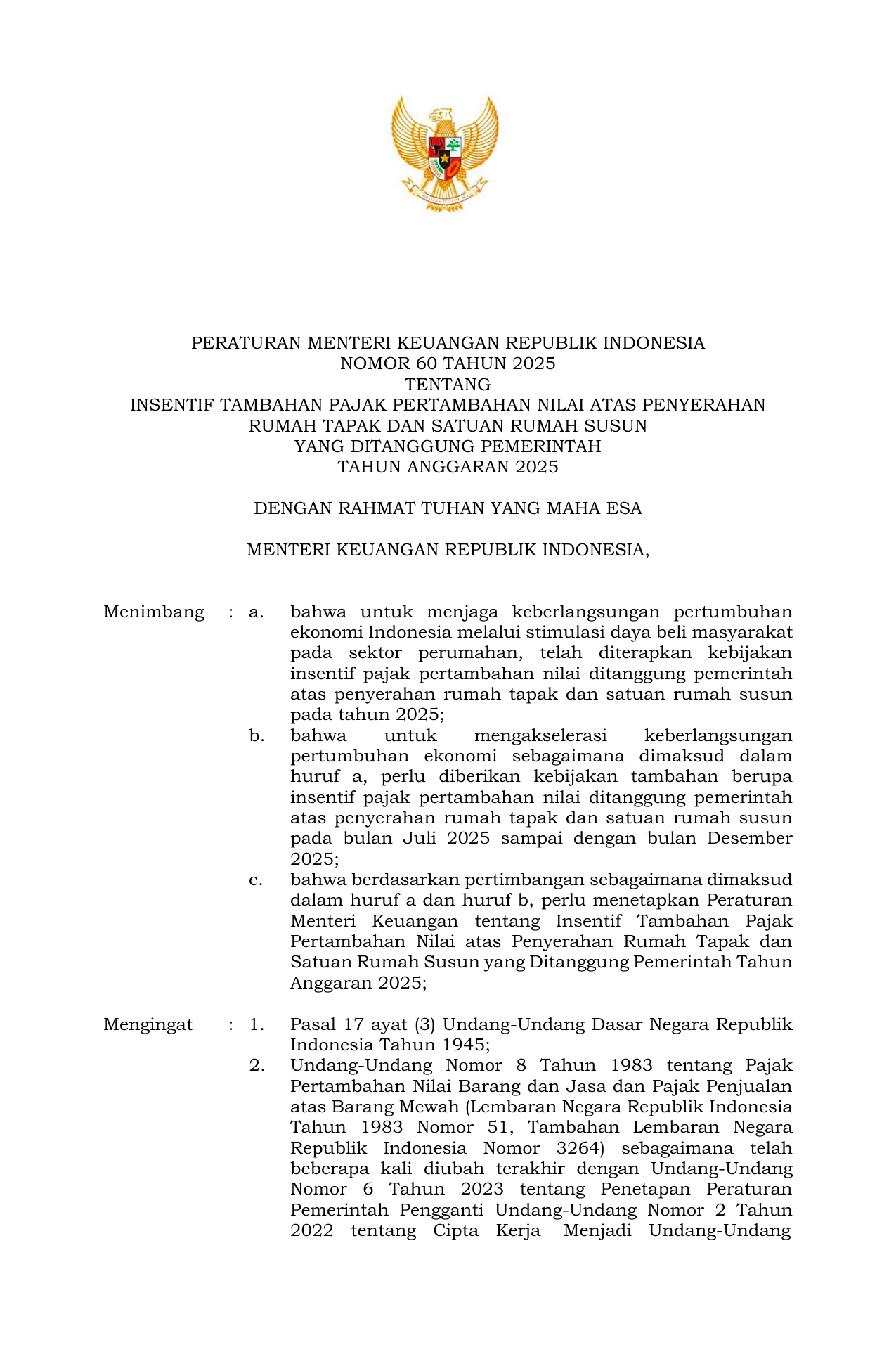 PERMEN Nomor 60 Tahun 2025 | Peraturan Menteri Nomor 60 Tahun 2025 tentang Insentif Tambahan Pajak Pertambahan Nilai atas Penyerahan Rumah Tapak dan Satuan Rumah Susun yang Ditanggung Pemerintah Tahun Anggaran 2025