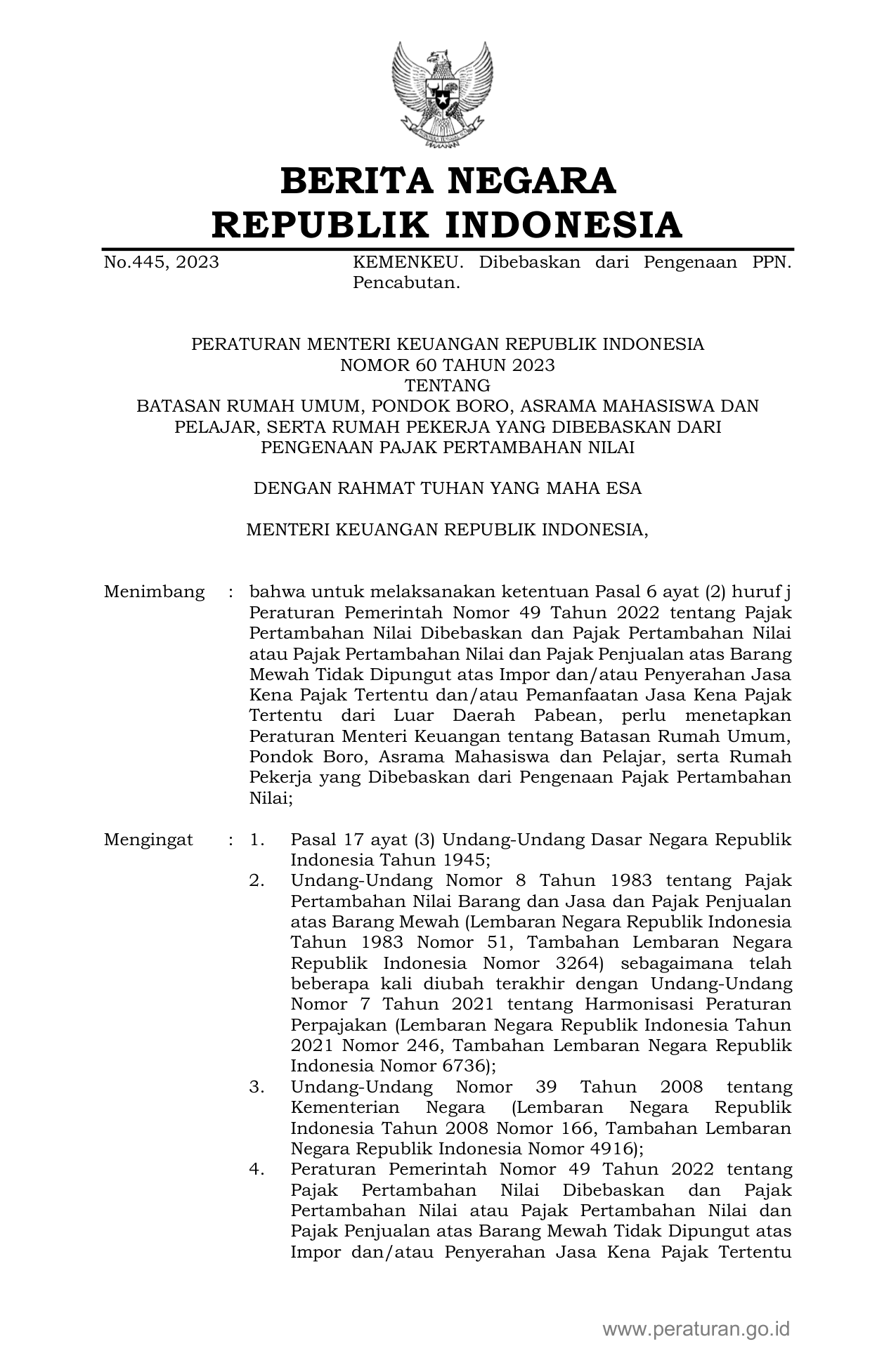 PERMEN Nomor 60 Tahun 2023 | Peraturan Menteri Nomor 60 Tahun 2023 tentang BATASAN RUMAH UMUM, PONDOK BORO, ASRAMA MAHASISWA DAN PELAJAR, SERTA RUMAH PEKERJA YANG DIBEBASKAN DARI PENGENAAN PAJAK PERTAMBAHAN NILAI