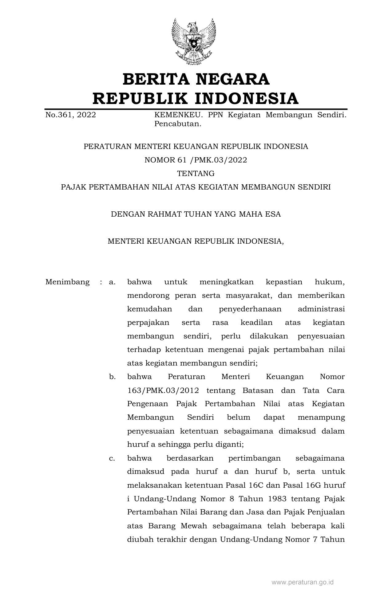 PERMEN Nomor 61-pmk-03-2022 Tahun 2022 | Peraturan Menteri Nomor 61-pmk-03-2022 Tahun 2022 tentang PAJAK PERTAMBAHAN NILAI ATAS KEGIATAN MEMBANGUN SENDIRI