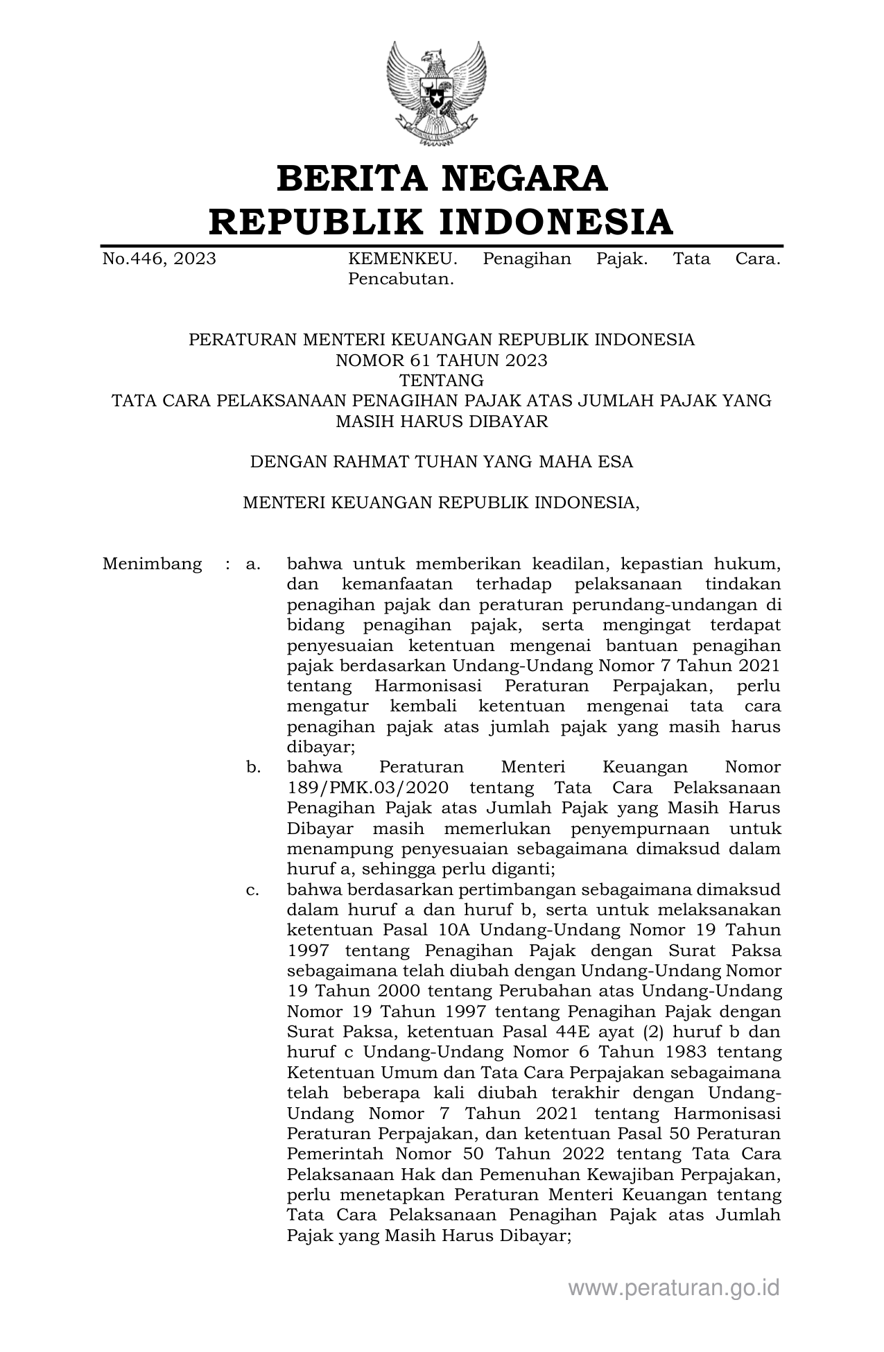 PERMEN Nomor 61 Tahun 2023 | Peraturan Menteri Nomor 61 Tahun 2023 tentang TATA CARA PELAKSANAAN PENAGIHAN PAJAK ATAS JUMLAH PAJAK YANG MASIH HARUS DIBAYAR