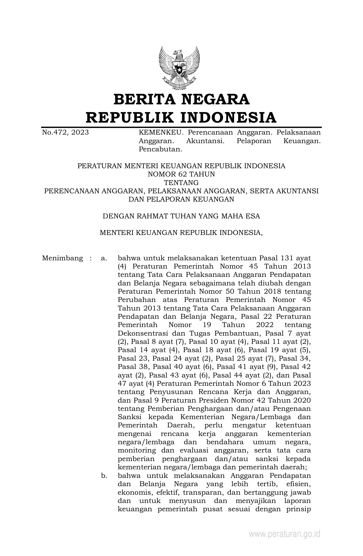 PERMEN Nomor 62 Tahun 2023 | Peraturan Menteri Nomor 62 Tahun 2023 tentang PERENCANAAN ANGGARAN, PELAKSANAAN ANGGARAN, SERTA AKUNTANSI DAN PELAPORAN KEUANGAN