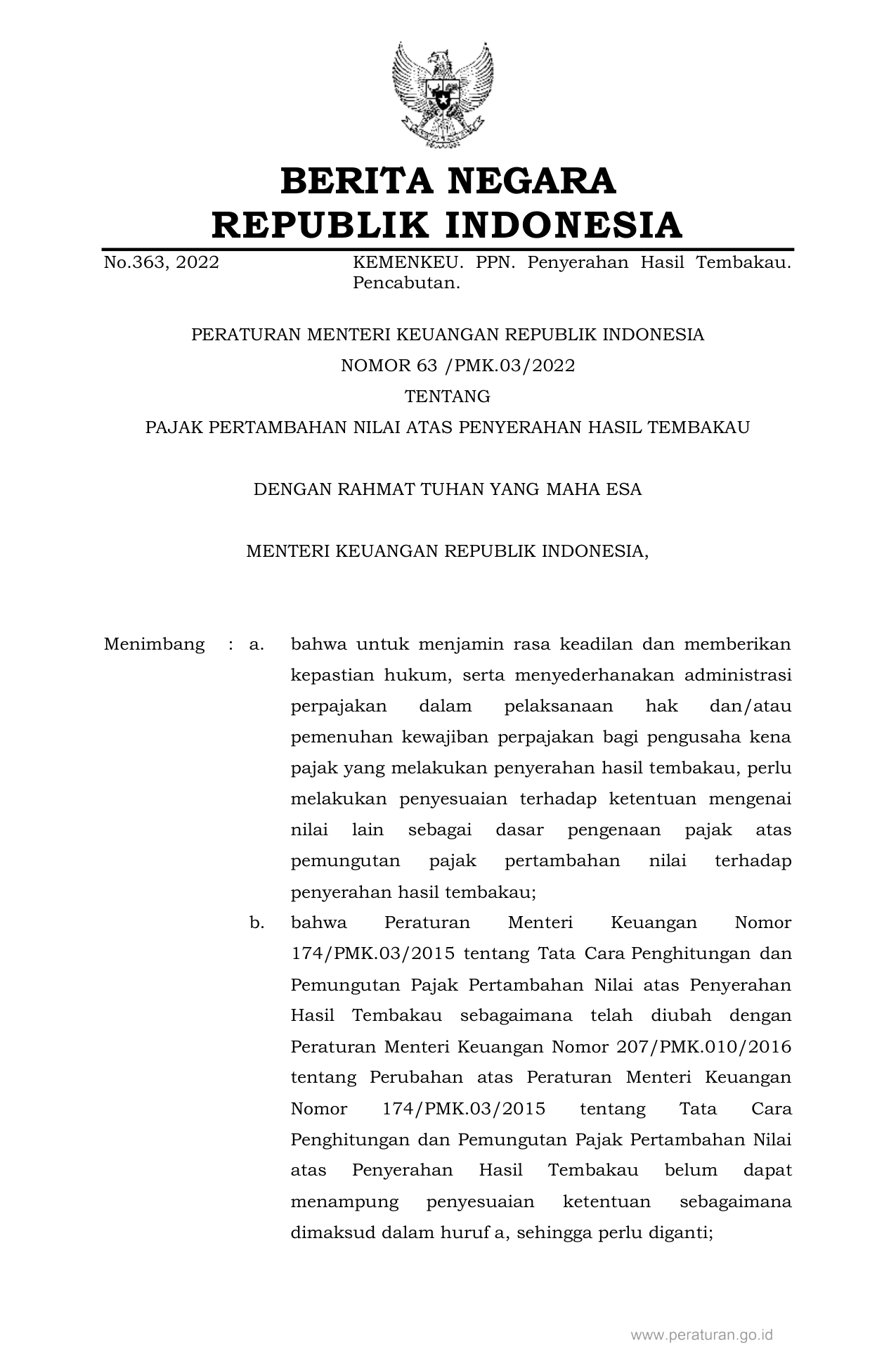 PERMEN Nomor 63-pmk-03-2022 Tahun 2022 | Peraturan Menteri Nomor 63-pmk-03-2022 Tahun 2022 tentang PAJAK PERTAMBAHAN NILAI ATAS PENYERAHAN HASIL TEMBAKAU