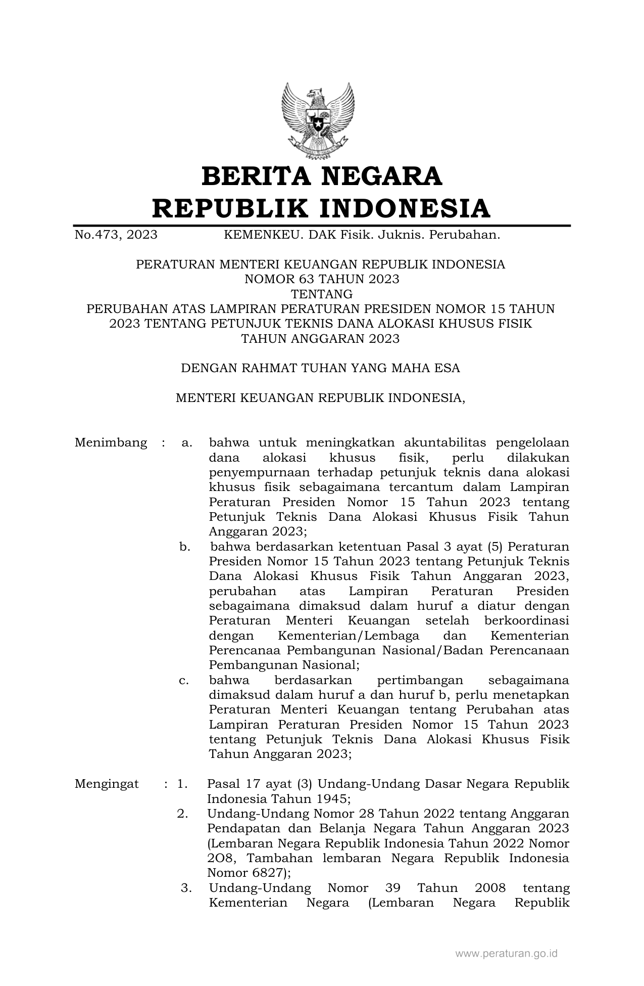 PERMEN Nomor 63 Tahun 2023 | Peraturan Menteri Nomor 63 Tahun 2023 tentang PERUBAHAN ATAS LAMPIRAN PERATURAN PRESIDEN NOMOR 15 TAHUN 2023 TENTANG PETUNJUK TEKNIS DANA ALOKASI KHUSUS FISIK TAHUN ANGGARAN 2023