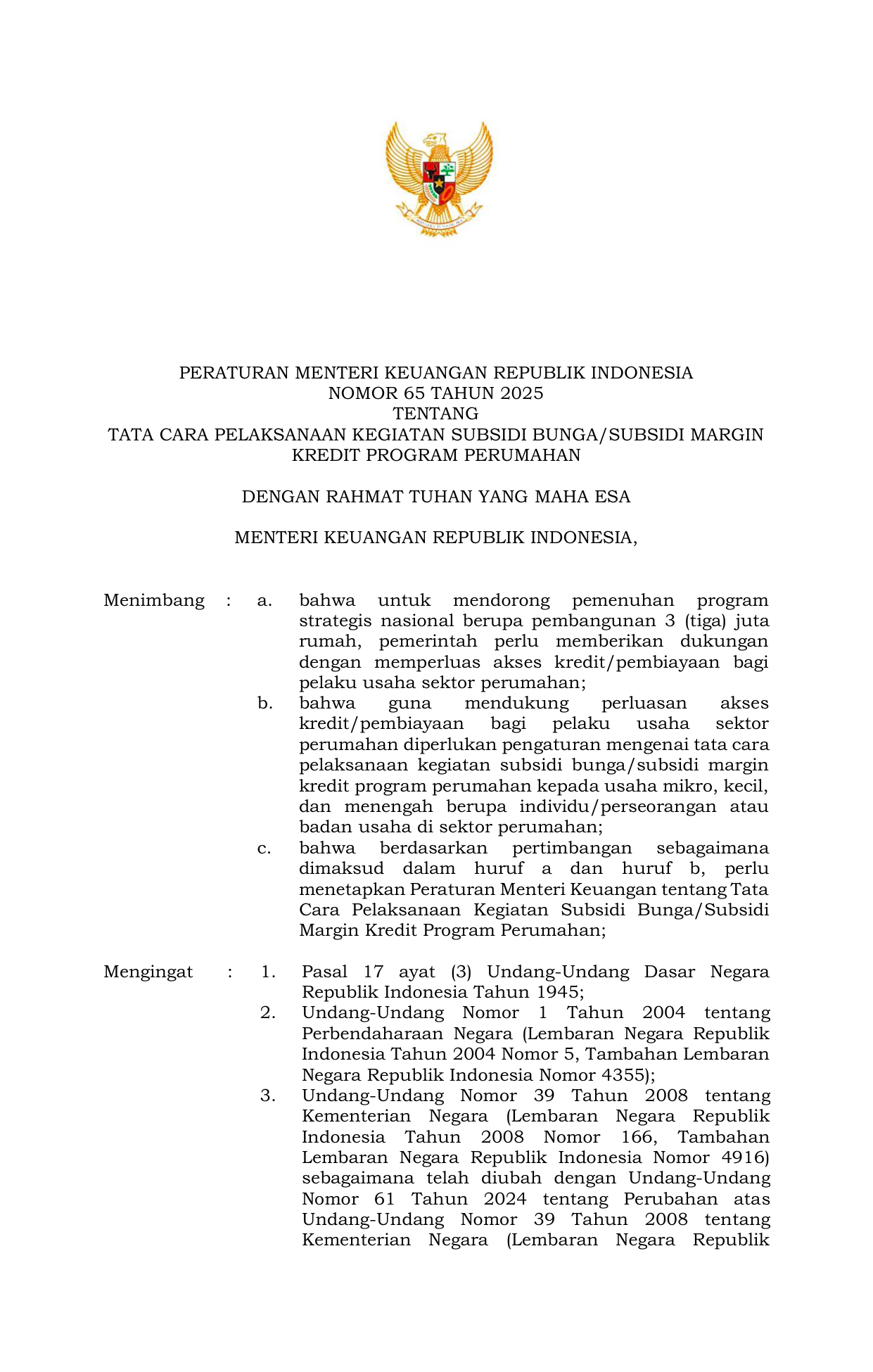 PERMEN Nomor 65 Tahun 2025 | Peraturan Menteri Nomor 65 Tahun 2025 tentang Tata Cara Pelaksanaan Kegiatan Subsidi Bunga/Subsidi Margin Kredit Program Perumahan
