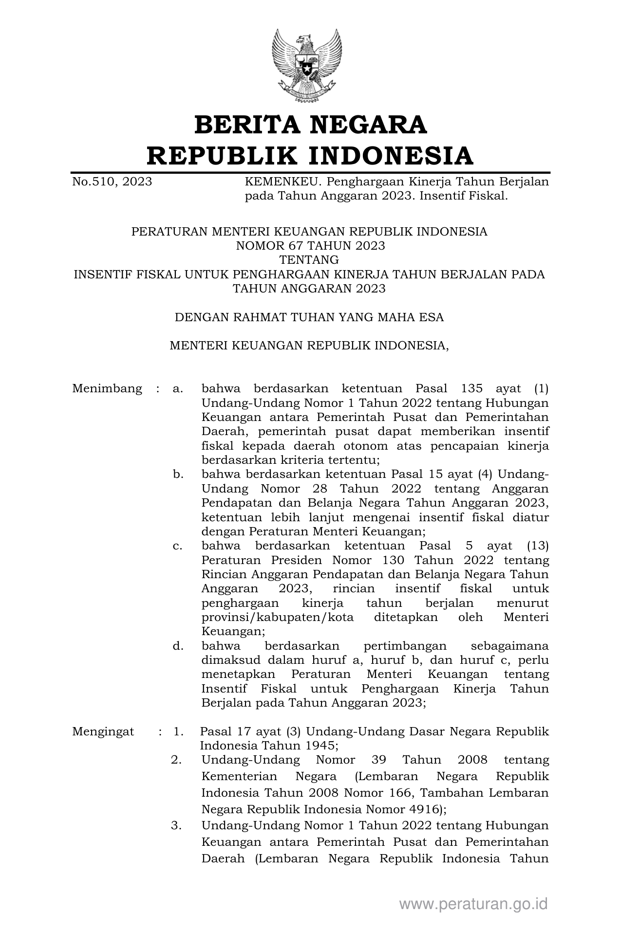 PERMEN Nomor 67 Tahun 2023 | Peraturan Menteri Nomor 67 Tahun 2023 tentang INSENTIF FISKAL UNTUK PENGHARGAAN KINERJA TAHUN BERJALAN PADA TAHUN ANGGARAN 2023