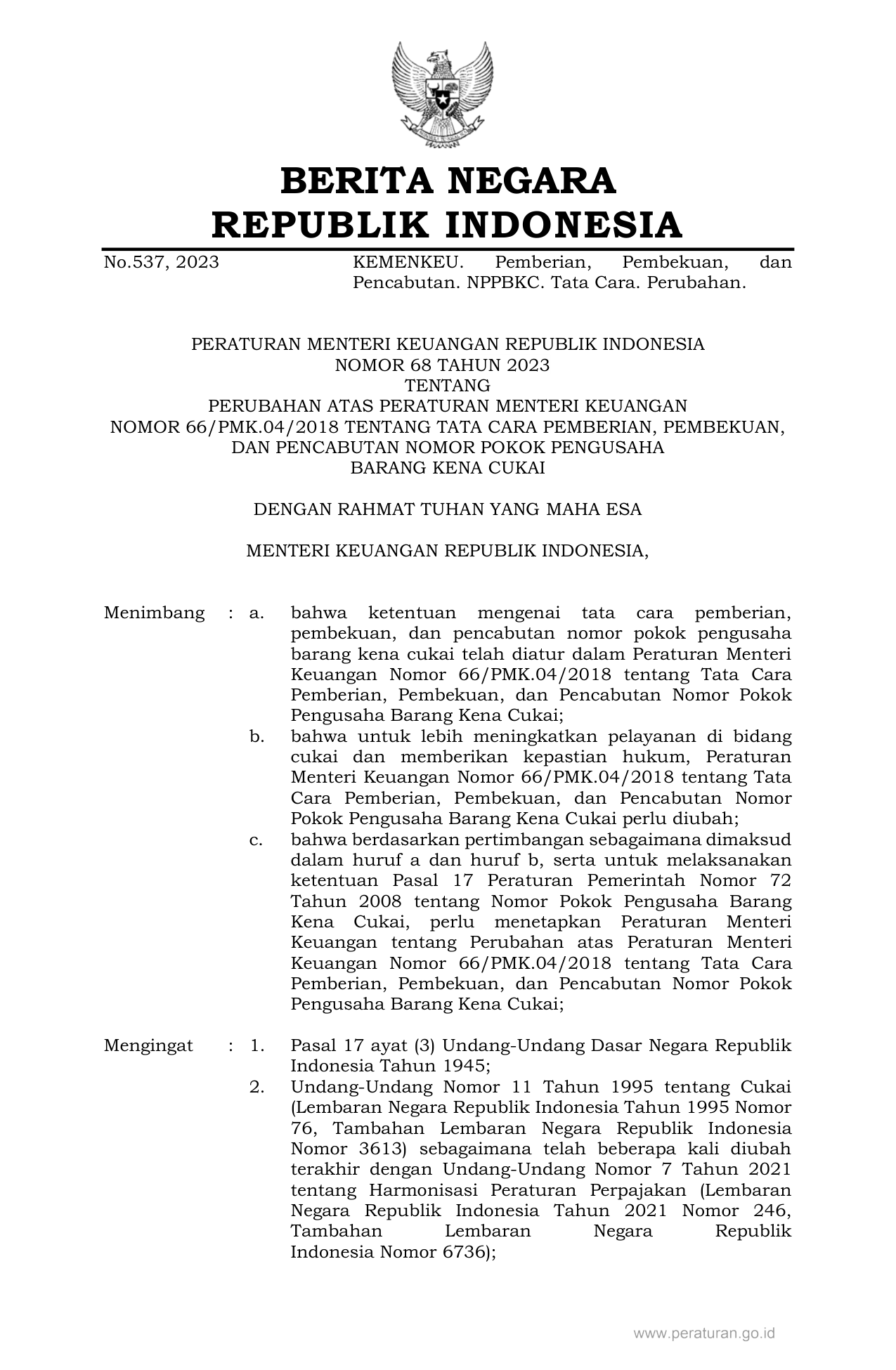 PERMEN Nomor 68 Tahun 2023 | Peraturan Menteri Nomor 68 Tahun 2023 tentang PERUBAHAN ATAS PERATURAN MENTERI KEUANGAN NOMOR 66/PMK.04/2018 TENTANG TATA CARA PEMBERIAN, PEMBEKUAN, DAN PENCABUTAN NOMOR POKOK PENGUSAHA BARANG KENA CUKAI