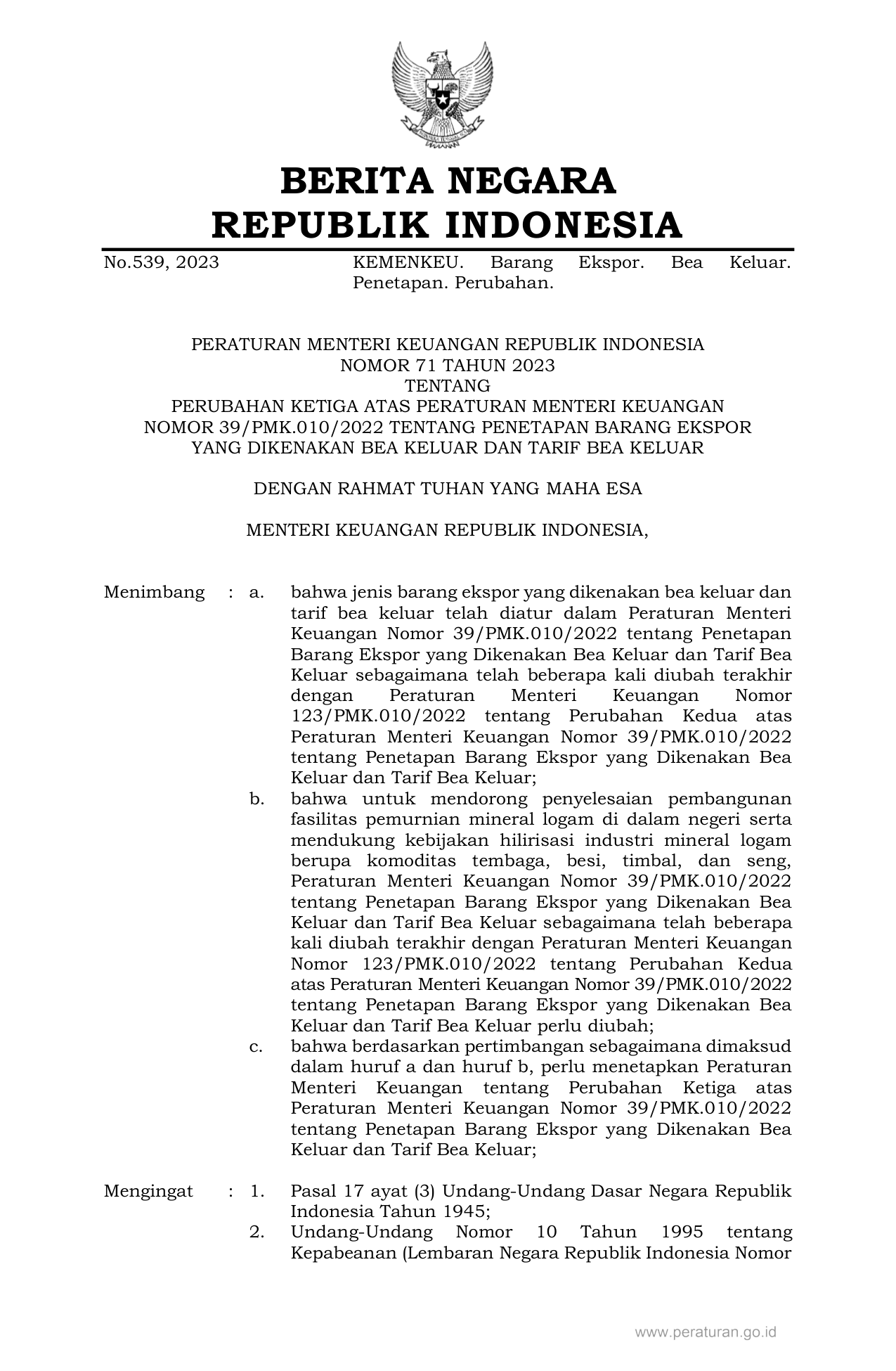 PERMEN Nomor 71 Tahun 2023 | Peraturan Menteri Nomor 71 Tahun 2023 tentang PERUBAHAN KETIGA ATAS PERATURAN MENTERI KEUANGAN NOMOR 39/PMK.010/2022 TENTANG PENETAPAN BARANG EKSPOR YANG DIKENAKAN BEA KELUAR DAN TARIF BEA KELUAR