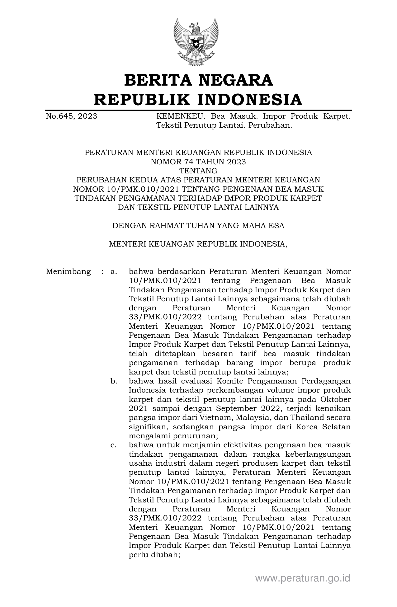 PERMEN Nomor 74 Tahun 2023 | Peraturan Menteri Nomor 74 Tahun 2023 tentang PERUBAHAN KEDUA ATAS PERATURAN MENTERI KEUANGAN NOMOR 10/PMK.010/2021 TENTANG PENGENAAN BEA MASUK TINDAKAN PENGAMANAN TERHADAP IMPOR PRODUK KARPET DAN TEKSTIL PENUTUP LANTAI LAINNYA