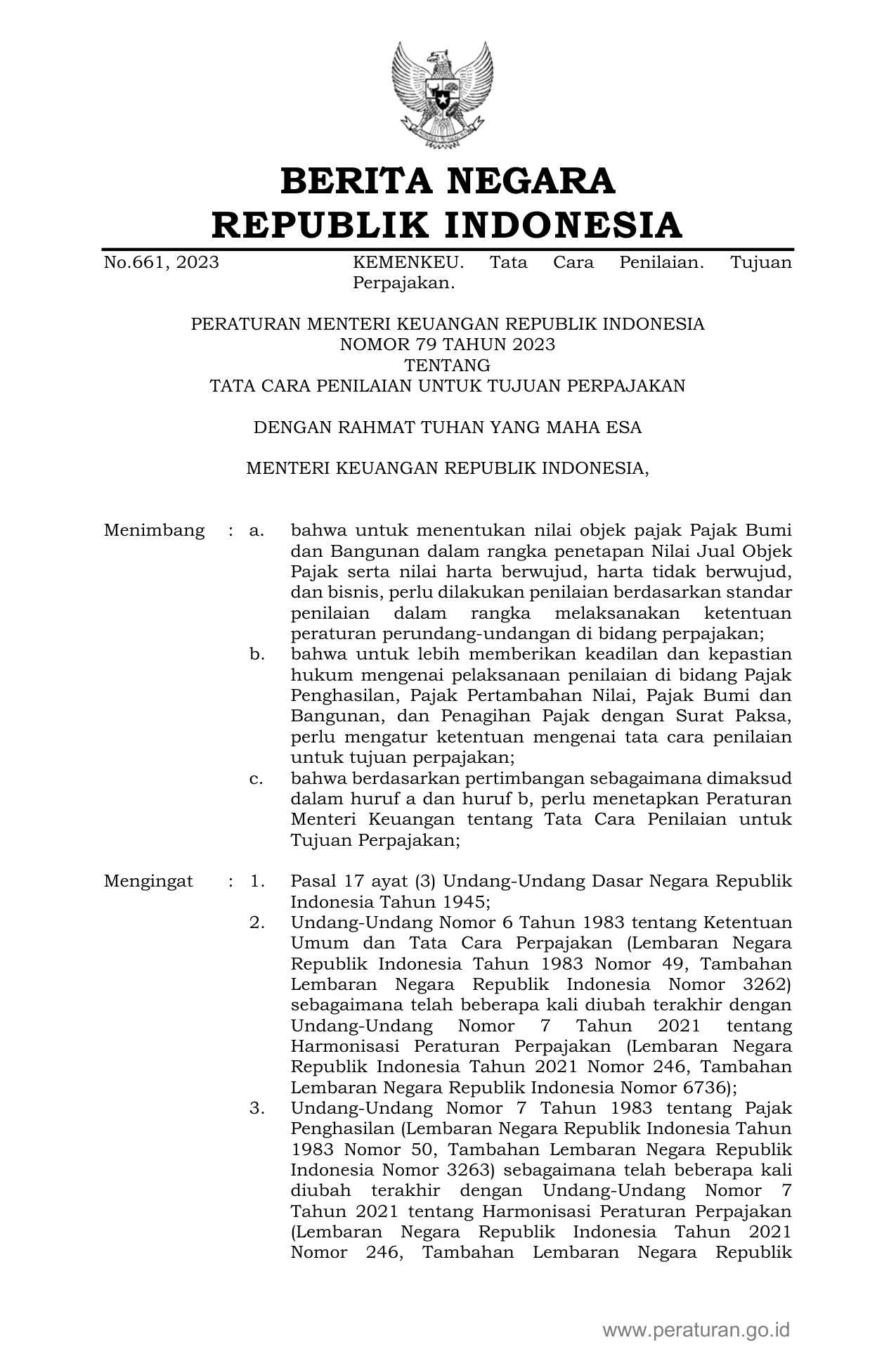 PERMEN Nomor 79 Tahun 2023 | Peraturan Menteri Nomor 79 Tahun 2023 tentang TATA CARA PENILAIAN UNTUK TUJUAN PERPAJAKAN