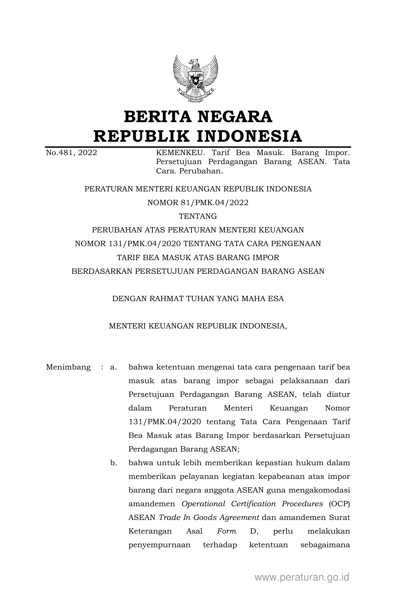 PERMEN Nomor 81-pmk-04-2022 Tahun 2022 | Peraturan Menteri Nomor 81-pmk-04-2022 Tahun 2022 tentang PERUBAHAN ATAS PERATURAN MENTERI KEUANGAN NOMOR 131/PMK.04/2020 TENTANG TATA CARA PENGENAAN TARIF BEA MASUK ATAS BARANG IMPOR BERDASARKAN PERSETUJUAN PERDAGANGAN BARANG ASEAN