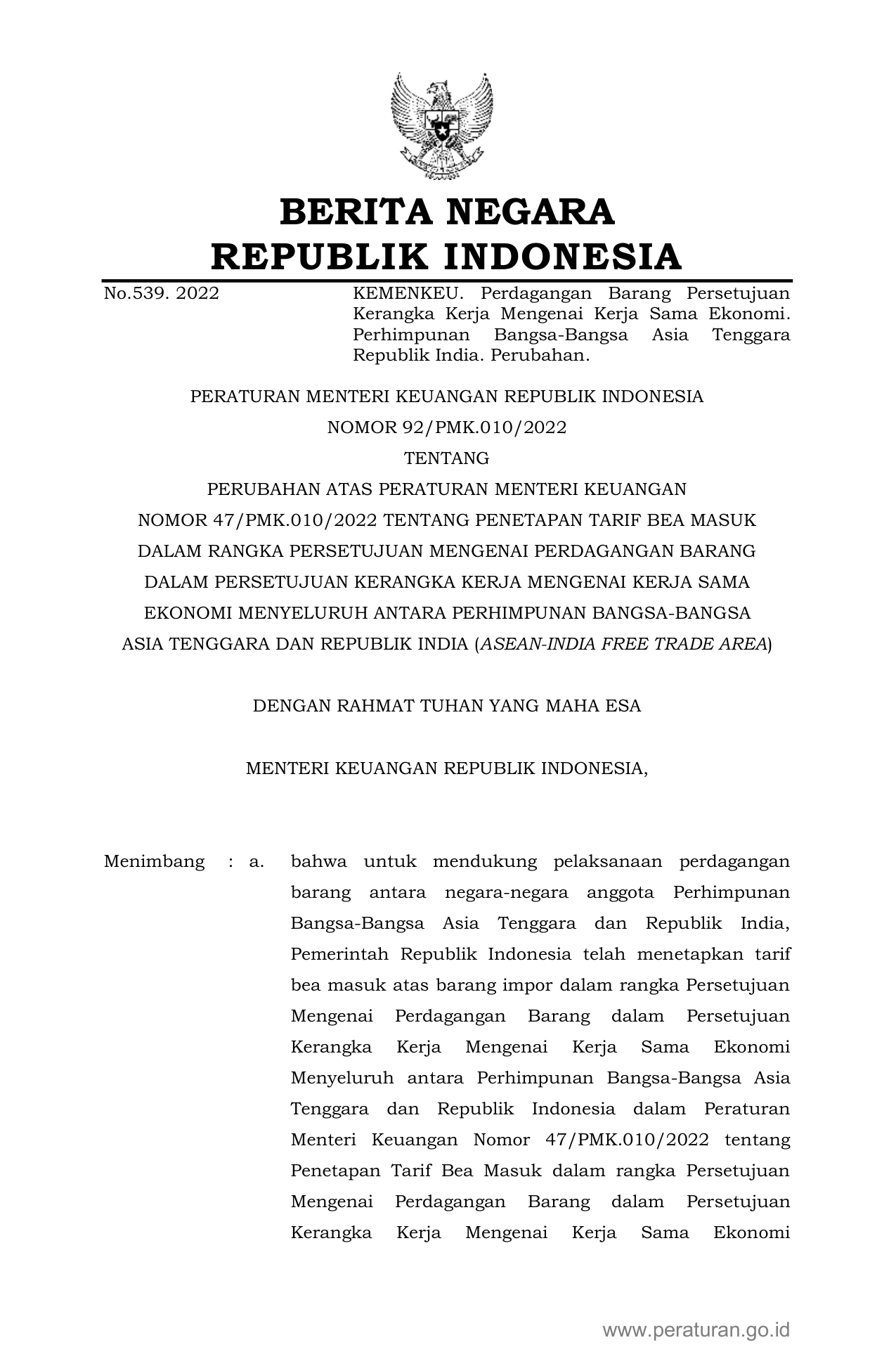 PERMEN Nomor 92-pmk-010-2022 Tahun 2022 | Peraturan Menteri Nomor 92-pmk-010-2022 Tahun 2022 tentang PERUBAHAN ATAS PERATURAN MENTERI KEUANGAN NOMOR 47/PMK.010/2022 TENTANG PENETAPAN TARIF BEA MASUK DALAM RANGKA PERSETUJUAN MENGENAI PERDAGANGAN BARANG DALAM PERSETUJUAN KERANGKA KERJA MENGENAI KERJA SAMA EKONOMI MENYELURUH ANTARA PERHIMPUNAN BANGSA-BANGSA ASIA TENGGARA DAN REPUBLIK INDIA (ASEAN-INDIA FREE TRADE AREA)