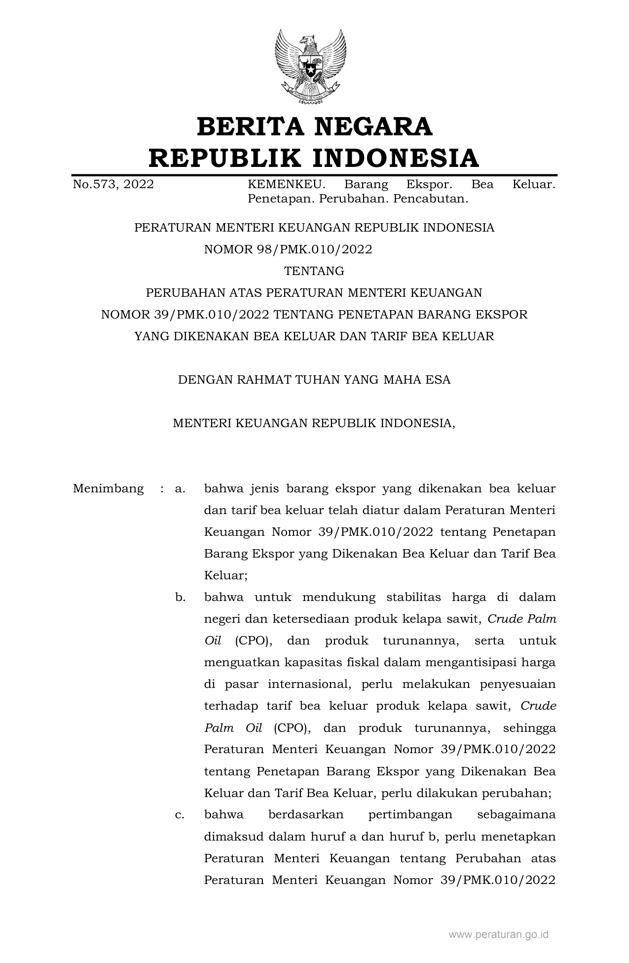 PERMEN Nomor 98-pmk-010-2022 Tahun 2022 | Peraturan Menteri Nomor 98-pmk-010-2022 Tahun 2022 tentang PERUBAHAN ATAS PERATURAN MENTERI KEUANGAN NOMOR 39/PMK.010/2022 TENTANG PENETAPAN BARANG EKSPOR YANG DIKENAKAN BEA KELUAR DAN TARIF BEA KELUAR