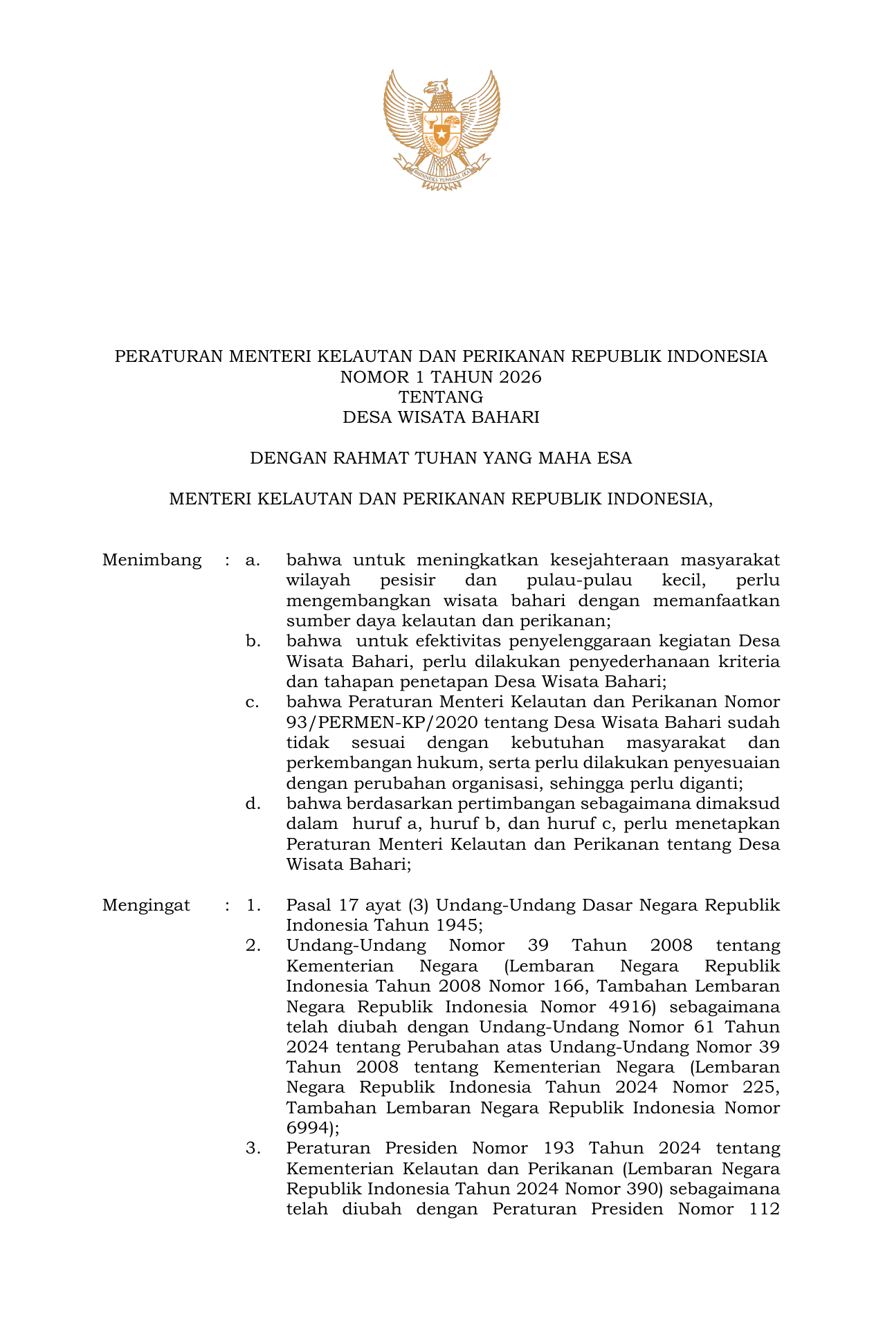 PERMEN Nomor 1 Tahun 2026 | Peraturan Menteri Nomor 1 Tahun 2026 tentang Desa Wisata Bahari
