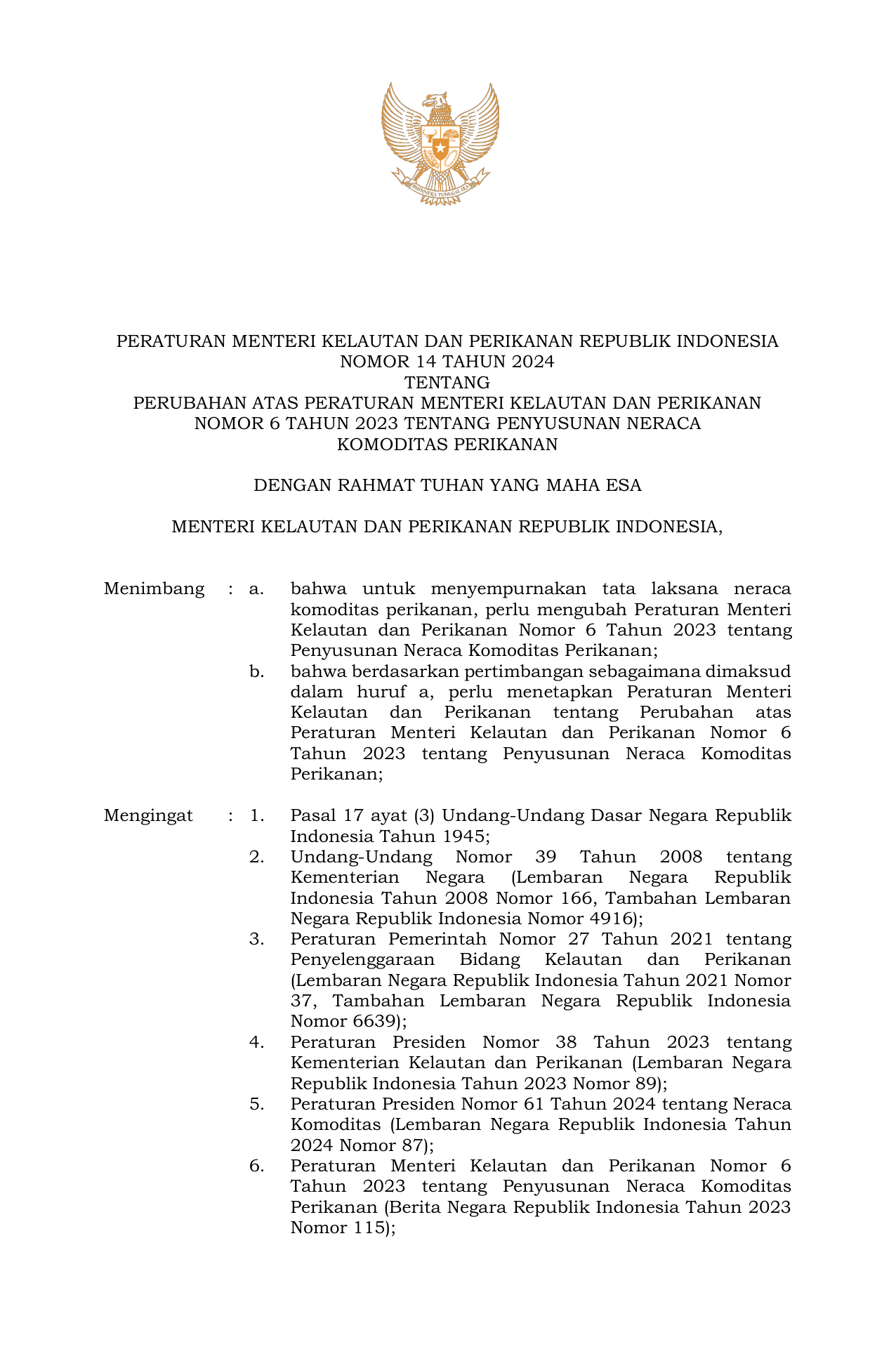PERMEN Nomor 14 Tahun 2024 | Peraturan Menteri Nomor 14 Tahun 2024 tentang Perubahan atas Peraturan Menteri Kelautan dan Perikanan Nomor 6 Tahun 2023 tentang Penyusunan Neraca Komoditas Perikanan