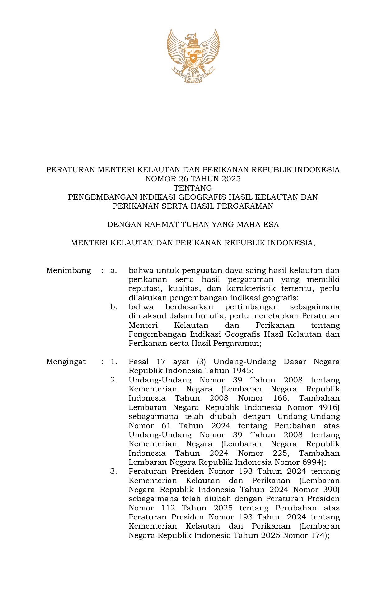 PERMEN Nomor 26 Tahun 2025 | Peraturan Menteri Nomor 26 Tahun 2025 tentang Pengembangan Indikasi Geografis Hasil Kelautan dan Perikanan serta Hasil Pergaraman