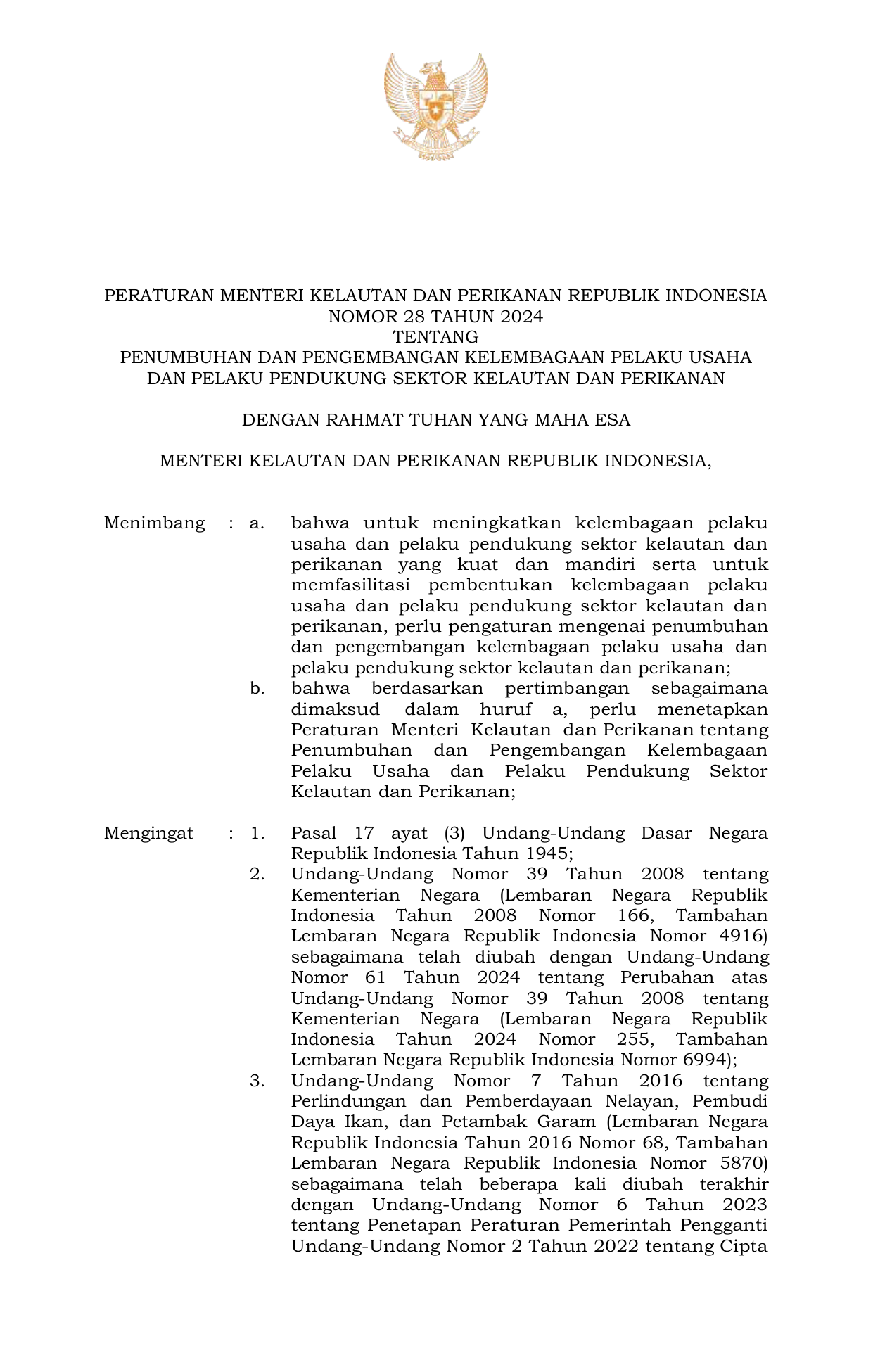 PERMEN Nomor 28 Tahun 2024 | Peraturan Menteri Nomor 28 Tahun 2024 tentang Penumbuhan dan Pengembangan Kelembagaan Pelaku Usaha dan Pelaku Pendukung Sektor Kelautan dan Perikanan