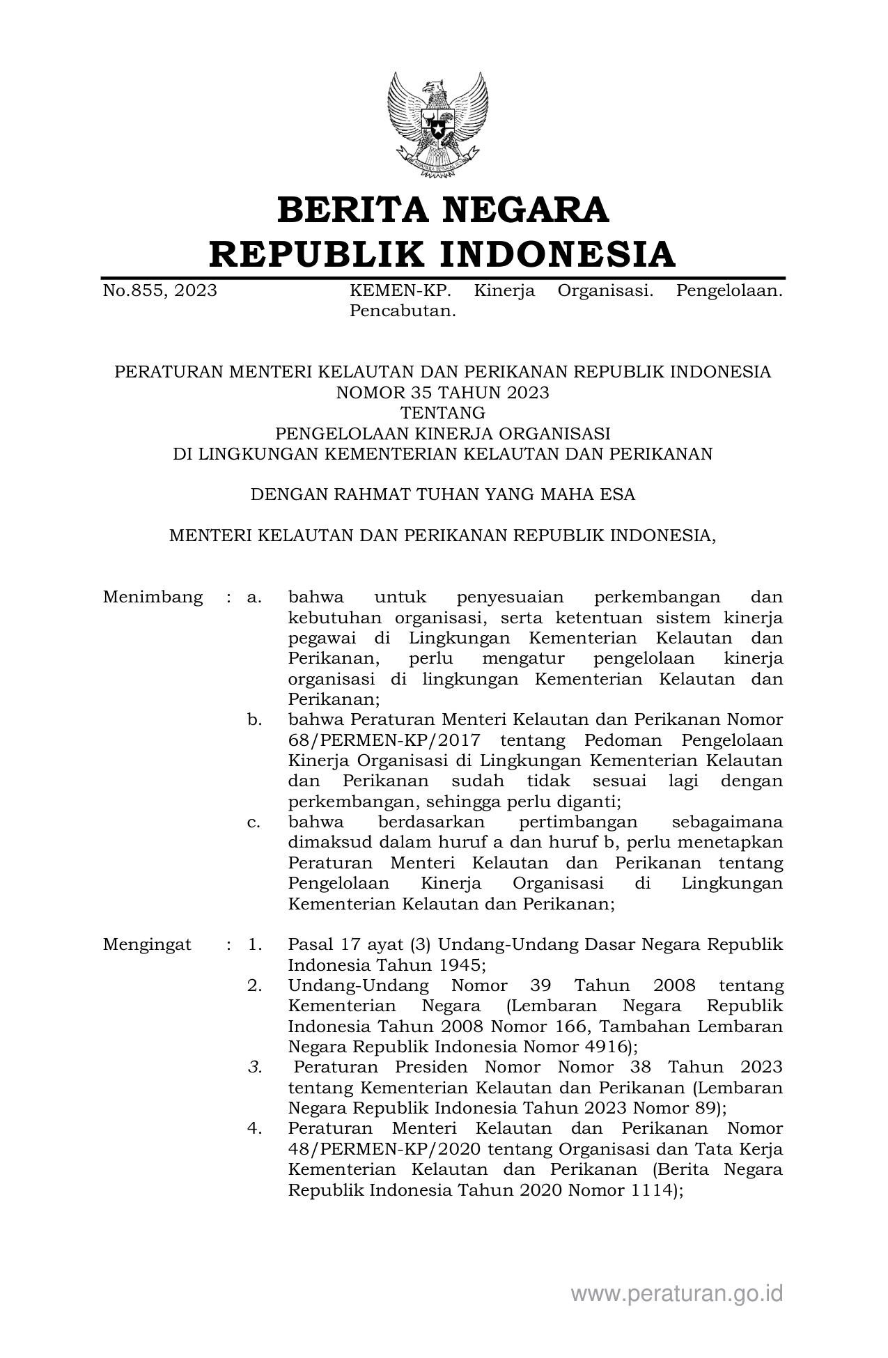 PERMEN Nomor 35 Tahun 2023 | Peraturan Menteri Nomor 35 Tahun 2023 tentang PENGELOLAAN KINERJA ORGANISASI DI LINGKUNGAN KEMENTERIAN KELAUTAN DAN PERIKANAN