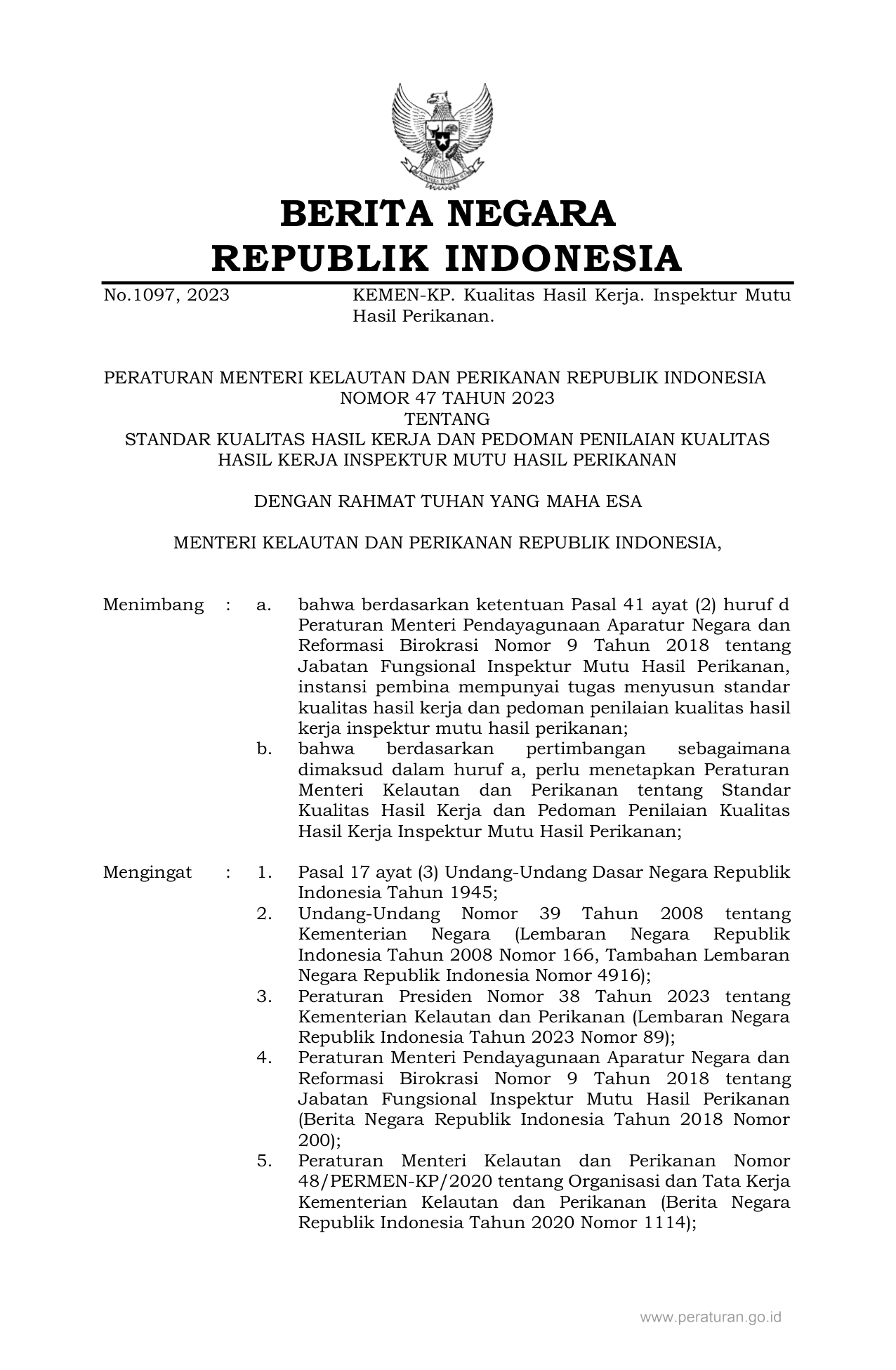 PERMEN Nomor 47 Tahun 2023 | Peraturan Menteri Nomor 47 Tahun 2023 tentang STANDAR KUALITAS HASIL KERJA DAN PEDOMAN PENILAIAN KUALITAS HASIL KERJA INSPEKTUR MUTU HASIL PERIKANAN
