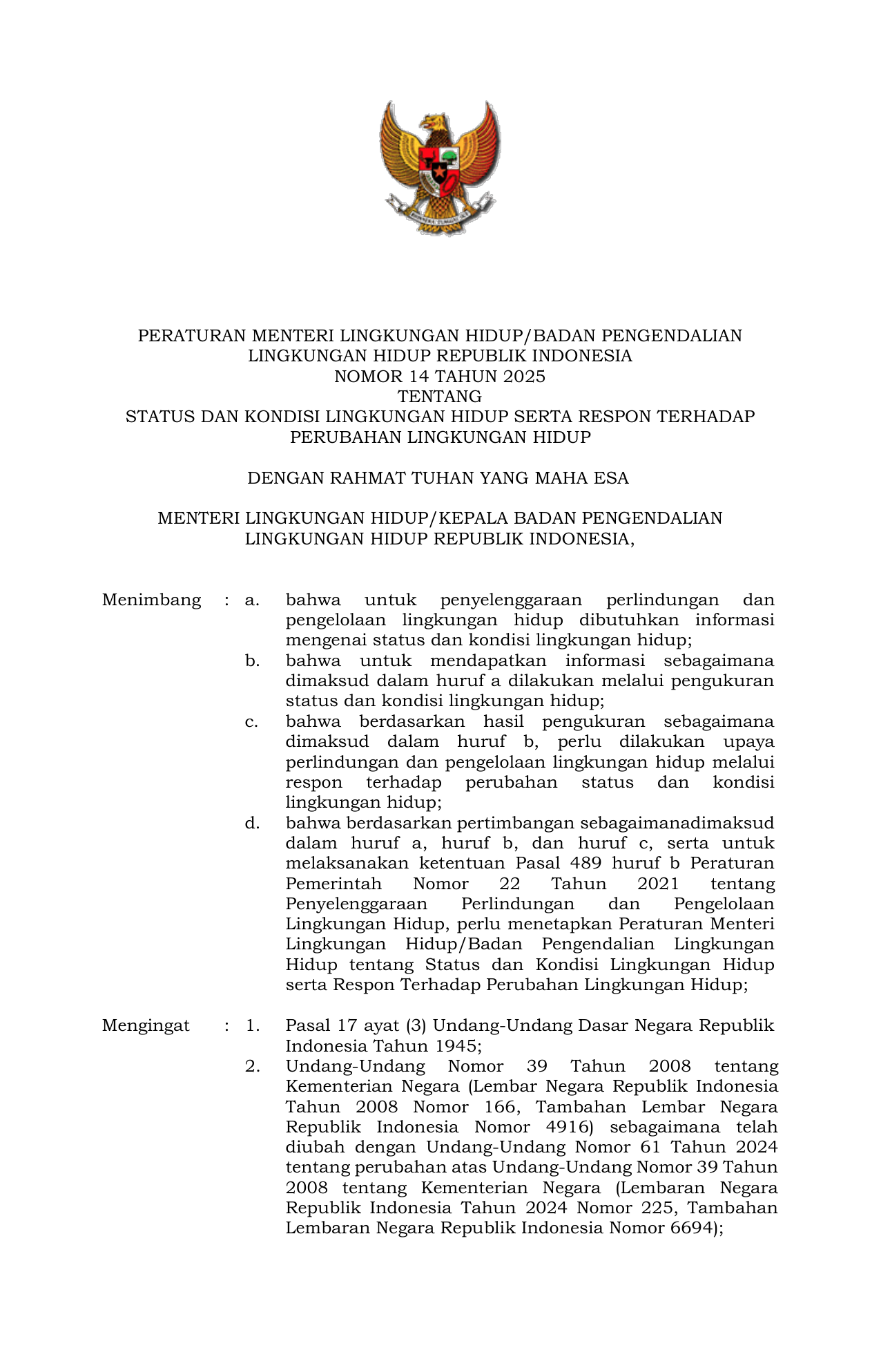PERMEN Nomor 14 Tahun 2025 | Peraturan Menteri Nomor 14 Tahun 2025 tentang Status dan Kondisi Lingkungan Hidup serta Respon Terhadap Perubahan Lingkungan Hidup