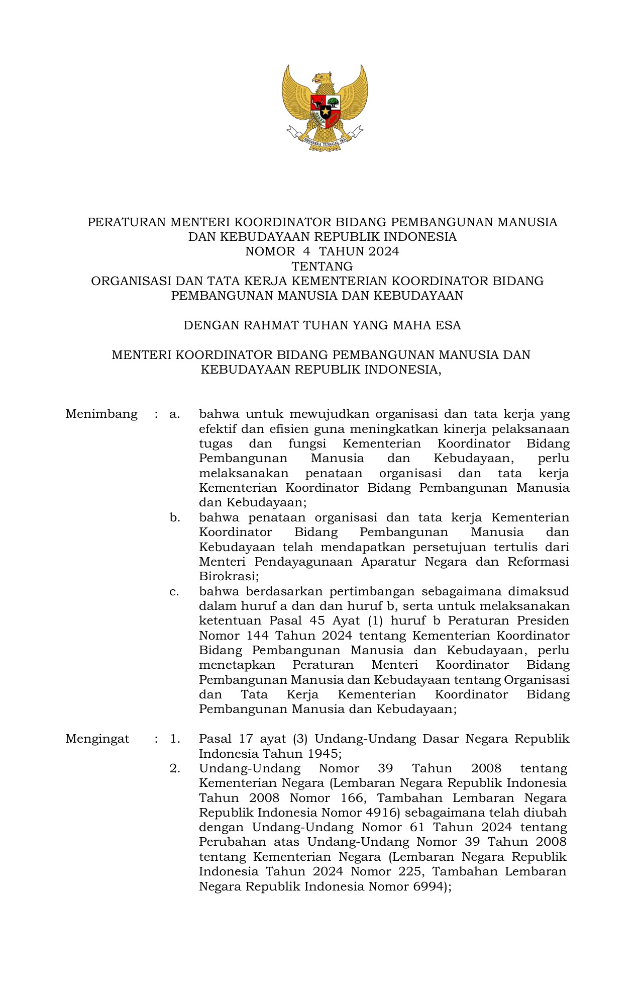 PERMEN Nomor 4 Tahun 2024 | Peraturan Menteri Nomor 4 Tahun 2024 tentang Organisasi dan Tata Kerja Kementerian Koordinator Bidang Pembangunan Manusia dan Kebudayaan