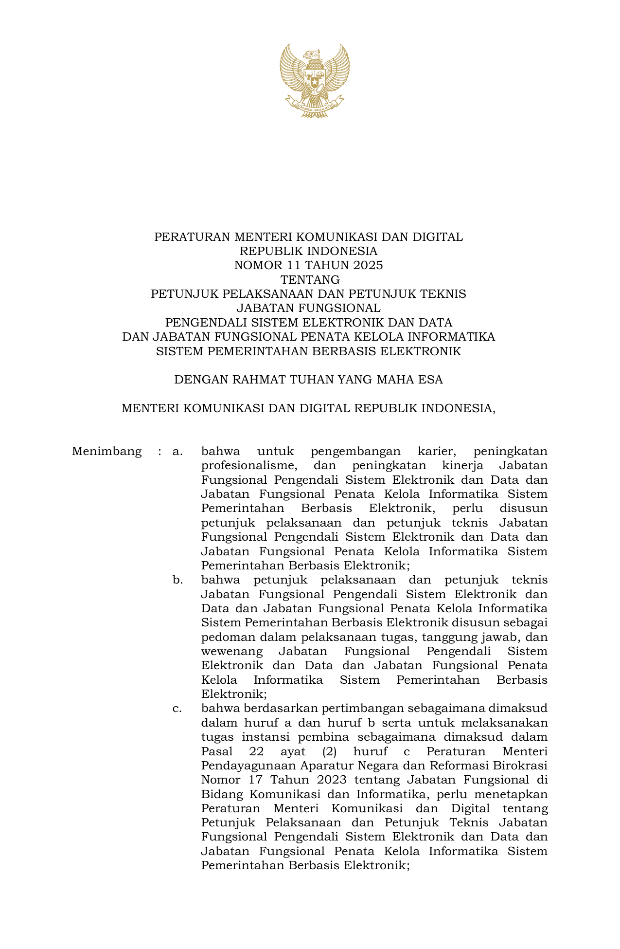 PERMEN Nomor 11 Tahun 2025 | Peraturan Menteri Nomor 11 Tahun 2025 tentang PETUNJUK PELAKSANAAN DAN PETUNJUK TEKNIS JABATAN FUNGSIONALPENGENDALI SISTEM ELEKTRONIK DAN DATA DAN JABATAN FUNGSIONAL PENATA KELOLA INFORMATIKA SISTEM PEMERINTAHAN BERBASIS ELEKTRONIK