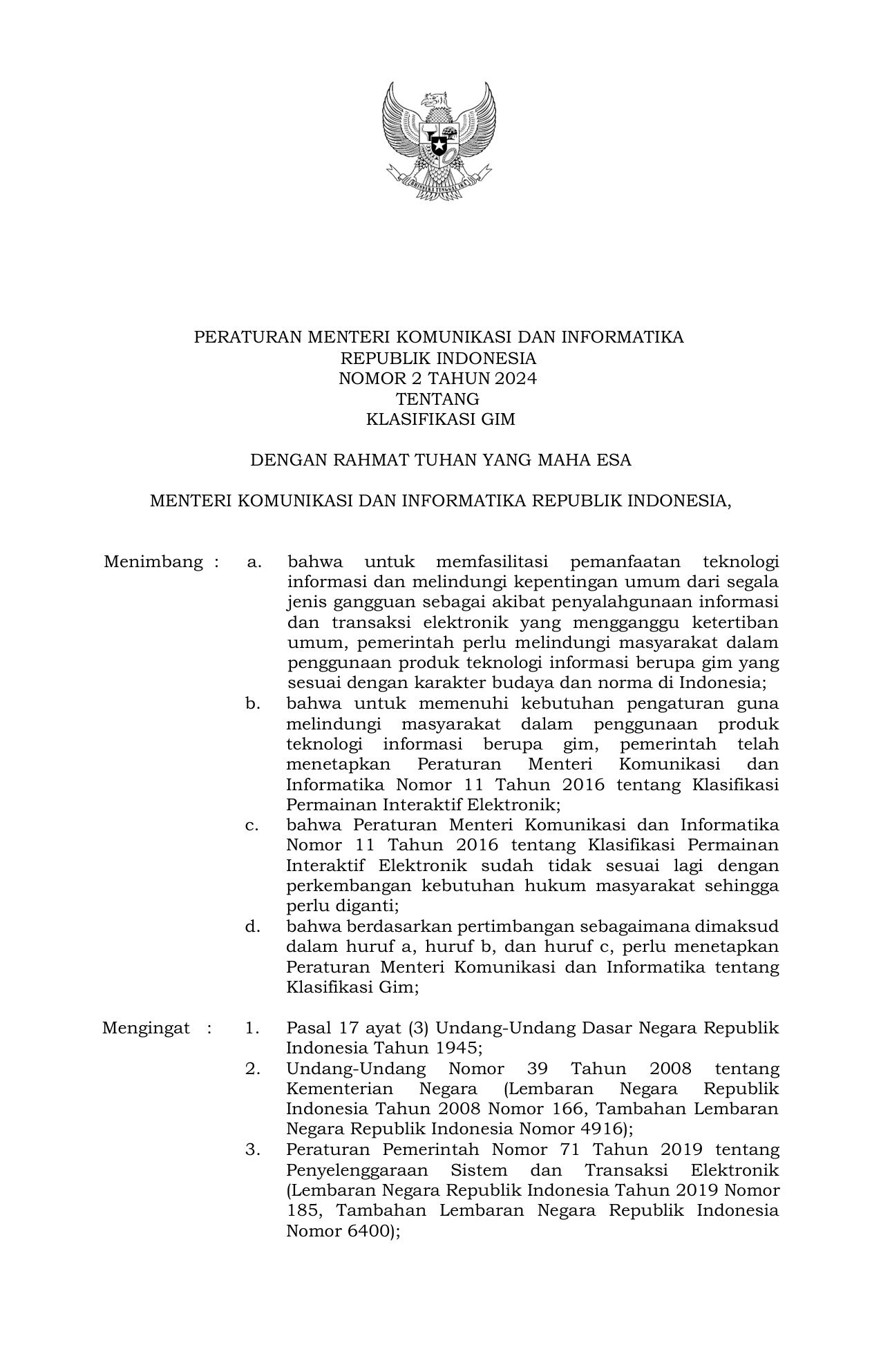 PERMEN Nomor 2 Tahun 2024 | Peraturan Menteri Nomor 2 Tahun 2024 tentang KLASIFIKASI GIM