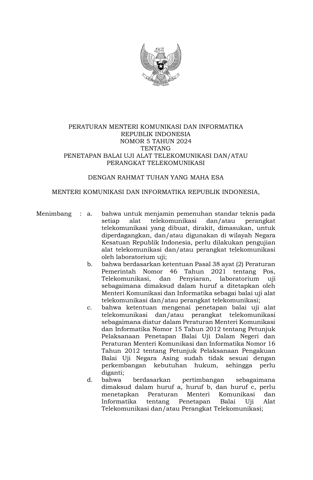 PERMEN Nomor 5 Tahun 2024 | Peraturan Menteri Nomor 5 Tahun 2024 tentang Penetapan Balai Uji Alat Telekomunikasi dan/atau Perangkat Telekomunikasi