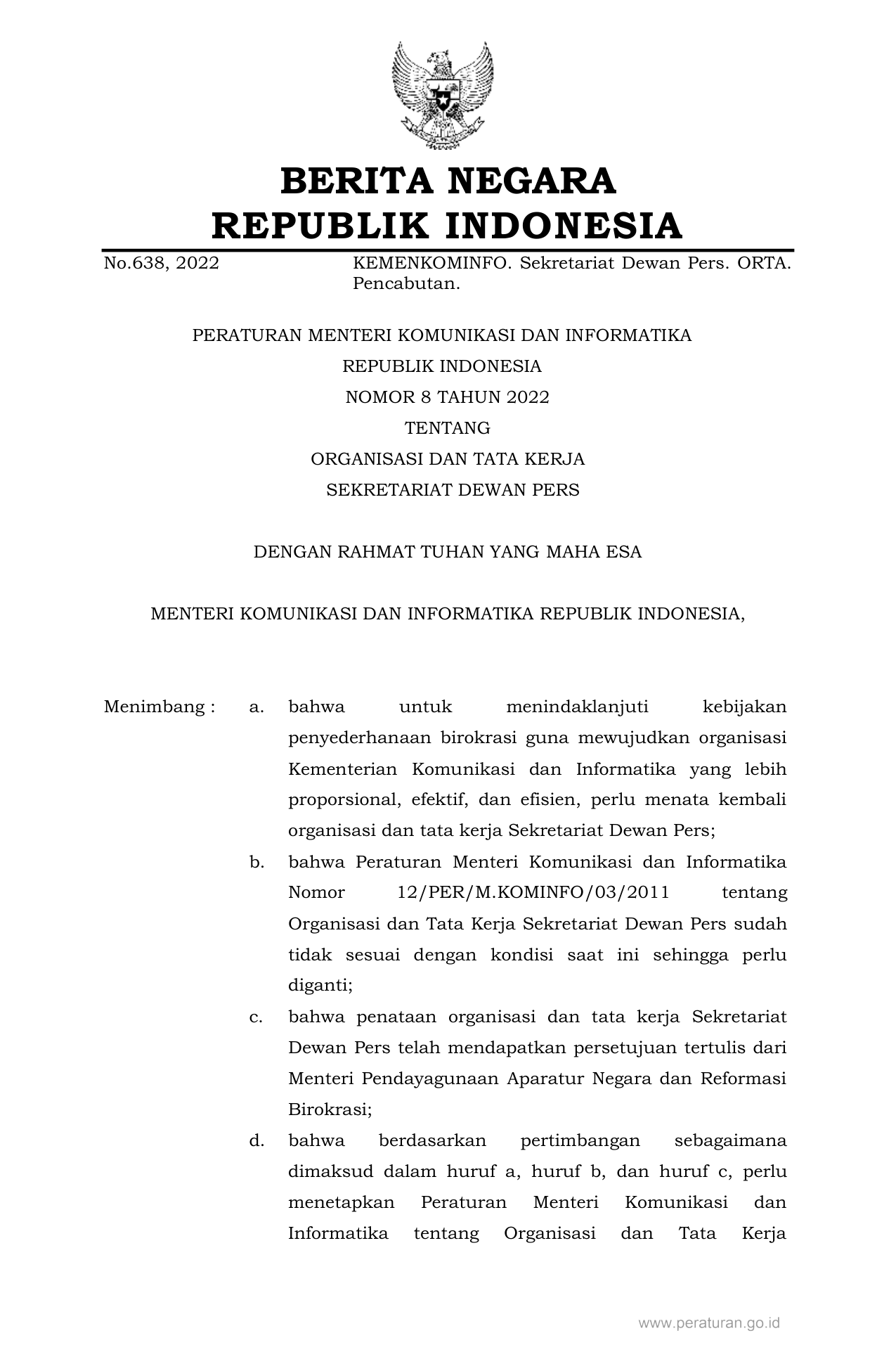 PERMEN Nomor 8 Tahun 2022 | Peraturan Menteri Nomor 8 Tahun 2022 tentang ORGANISASI DAN TATA KERJA SEKRETARIAT DEWAN PERS