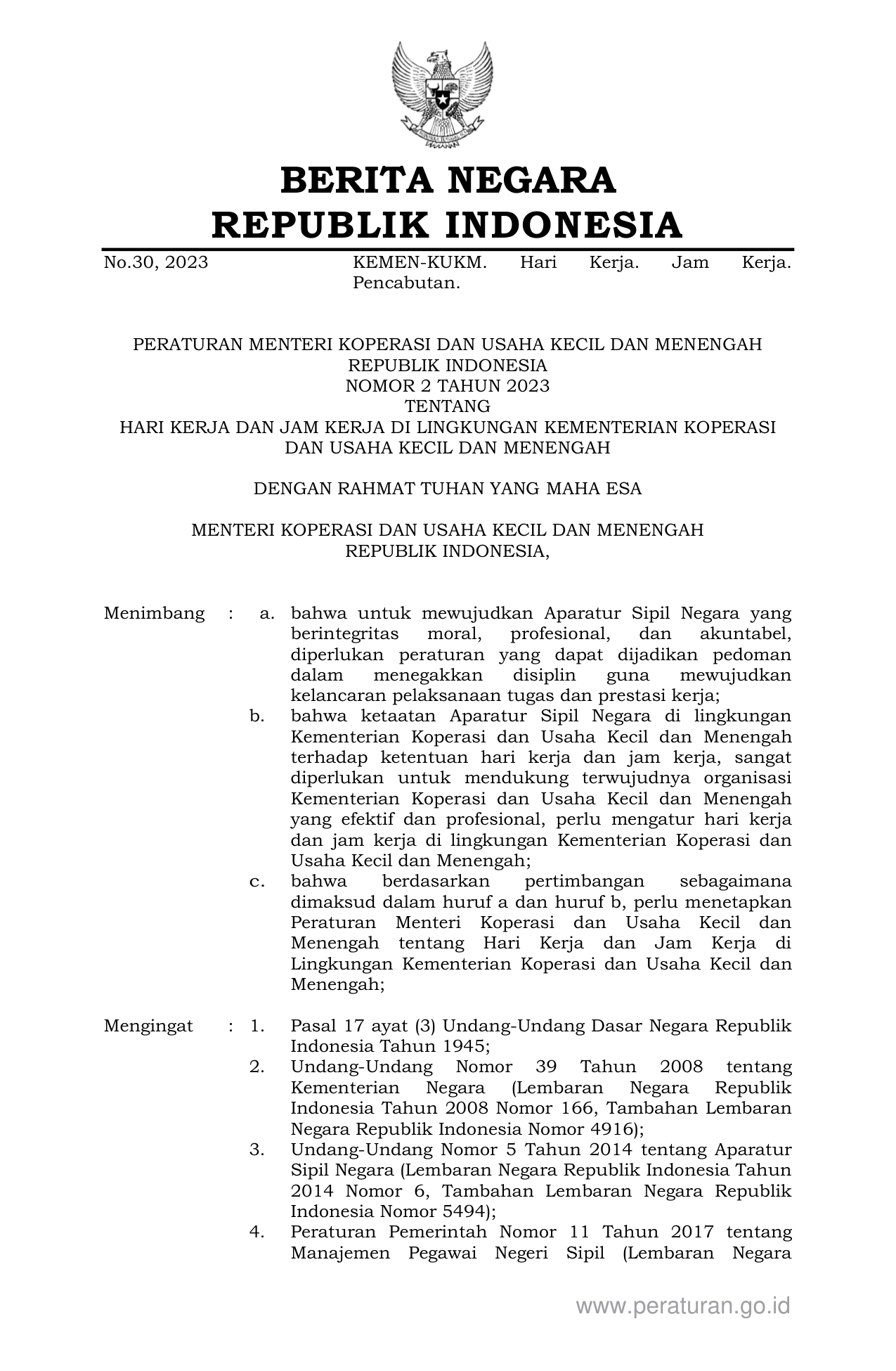 PERMEN Nomor 2 Tahun 2023 | Peraturan Menteri Nomor 2 Tahun 2023 tentang HARI KERJA DAN JAM KERJA DI LINGKUNGAN KEMENTERIAN KOPERASI DAN USAHA KECIL DAN MENENGAH