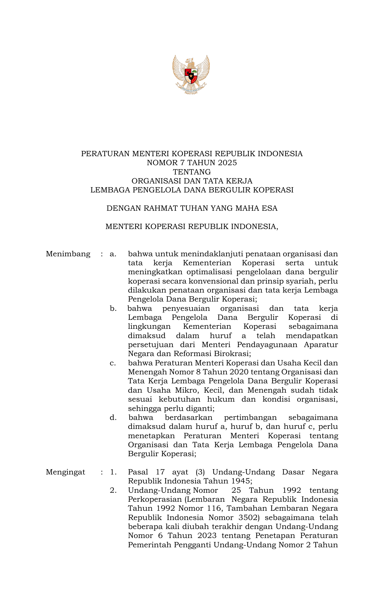 PERMEN Nomor 7 Tahun 2025 | Peraturan Menteri Nomor 7 Tahun 2025 tentang Organisasi dan Tata Kerja Lembaga Pengelola Dana Bergulir Koperasi